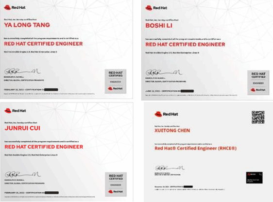 本网讯(信息技术学院 陆航) 一分耕耘,一分收获!我院计算机网络技术专业2022届毕业生陈雪彤、崔俊瑞、李博士、唐亚龙4位同学顺利通过红帽RHCE认证考试,取得红帽认证工程师资格。