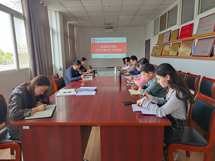 本网讯(信息技术学院 严晓曼)4月13日下午,信息技术学院在知行楼304会议室召开四月份班主任工作例会,参加会议的有院党总支书记王胜、副书记杨庆颖,各年级辅导员及全体班主任。会议由杨庆颖主持。