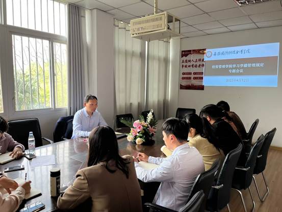 本网讯(经贸管理学院 聂垚)为进一步贯彻学校学生工作部署,落实落细学校学籍管理工作举措,4月12日下午,学院组织召开学习学校学籍管理规定专题会议,全体辅导员、班主任参加会议,会议由院党总支书记刘峰主持。