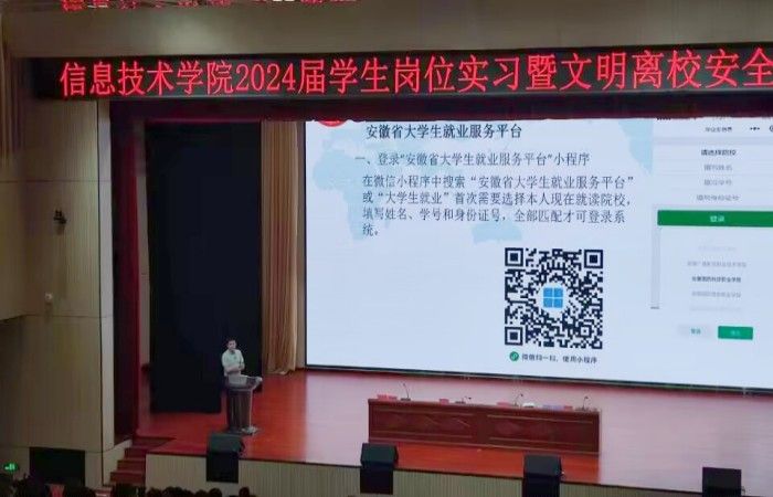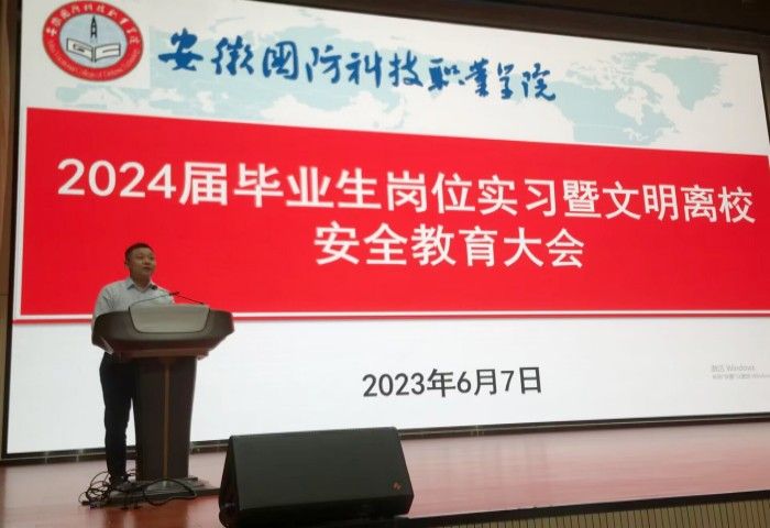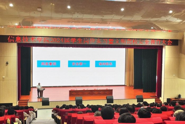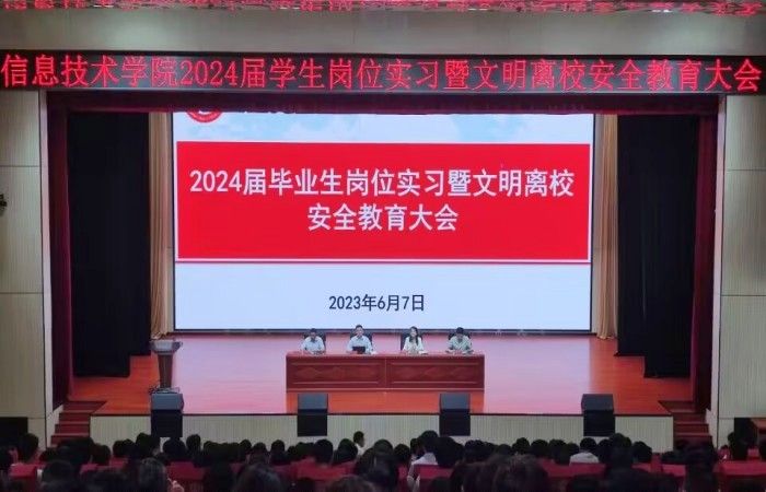 本网讯(信息技术学院 马士君)6月7日下午,信息技术学院在产教融合中心A区多功能报告厅召开了2024届毕业生岗位实习暨文明离校安全教育大会。校党委委员、信息技术学院院长沙有闯,副院长雷惊鹏,党总支副书记杨庆颖,以及各顶岗实习指导老师、辅导员、班主任出席会议,大会由雷惊鹏主持,2024届近1200名在校生分两批次参加会议。