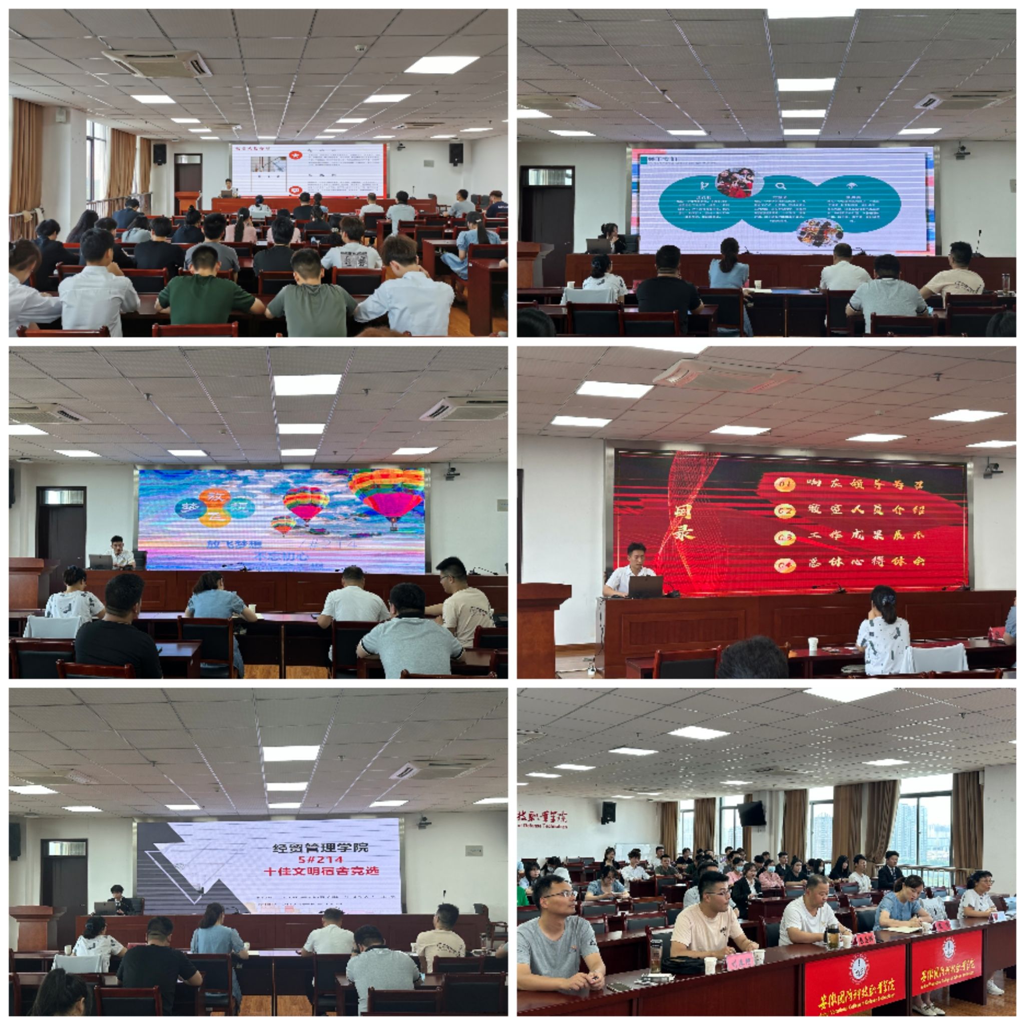 参选十佳文明标兵宿舍汇报人按照抽签顺序依次上台进行PPT,围绕安全卫生、文化氛围、学业成绩、人际关系、学风舍风等方面,充分展现了国防学子积极向上的精神面貌和青春朝气,展示了万象城官网安全稳定、文明整洁、健康向上、温馨和谐的宿舍文化氛围。