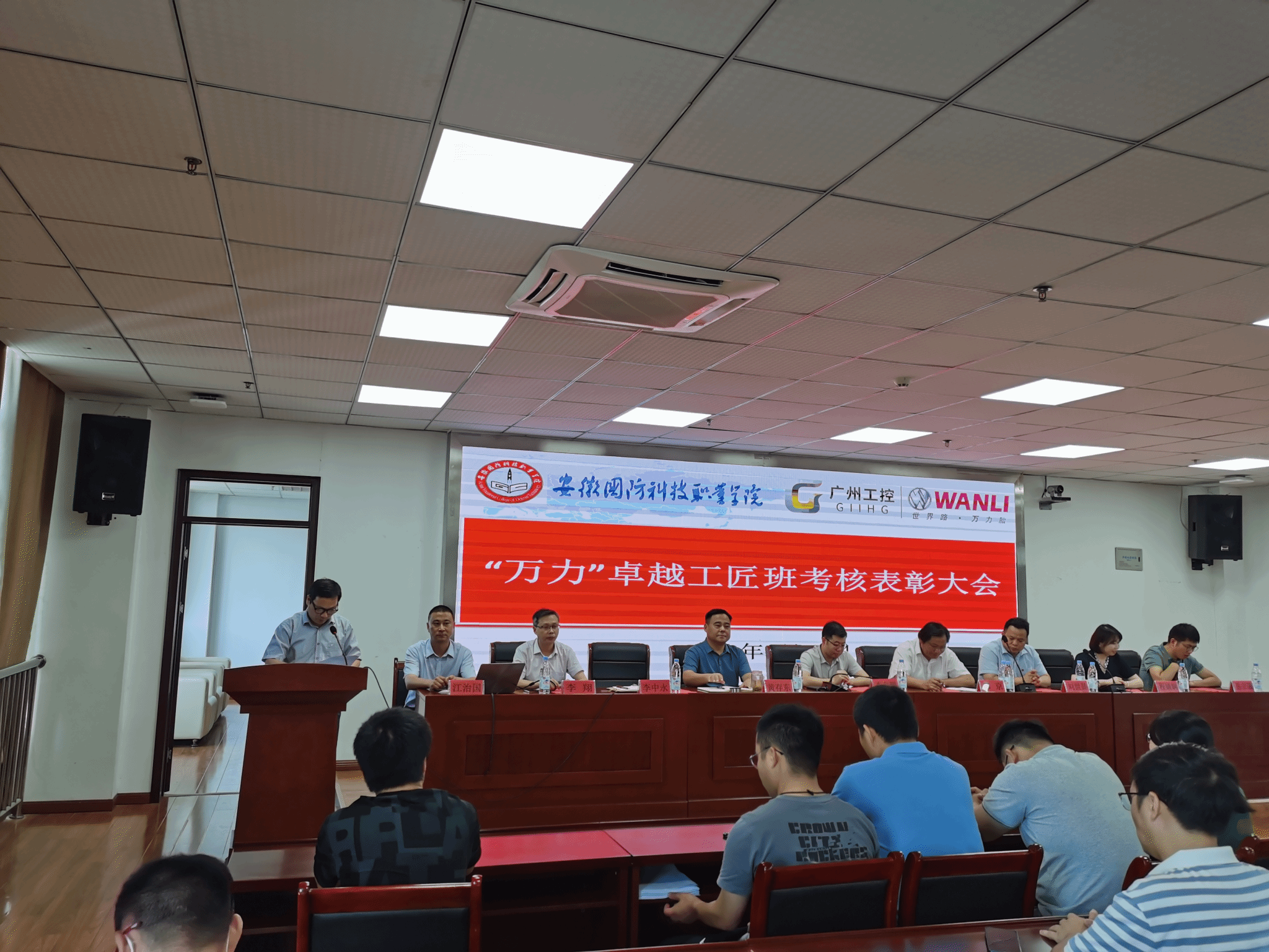 本网讯(电气技术学院 吴年祥)为进一步推进卓越工匠人才的培养,弘扬“锐意进取,精益求精,工作严谨、爱岗敬业”的工匠精神,6月26日,电气技术学院组织开展“万力”卓越工匠班年度考核表彰大会。合肥万力轮胎有限公司党总支副书记、工会主席邓京,副总工程师刘世显,人力资源部部长程婧娴,校党委委员、副校长李存鹏,校党委委员、工会主席、质量管理办公室主任黄存东、校企合作办公室主任李中永,电气技术学院院长李翔等校企双方领导,以及学院教师和工匠班指导老师和全体学员参加,会议由电气技术学院副院长江治国主持。
