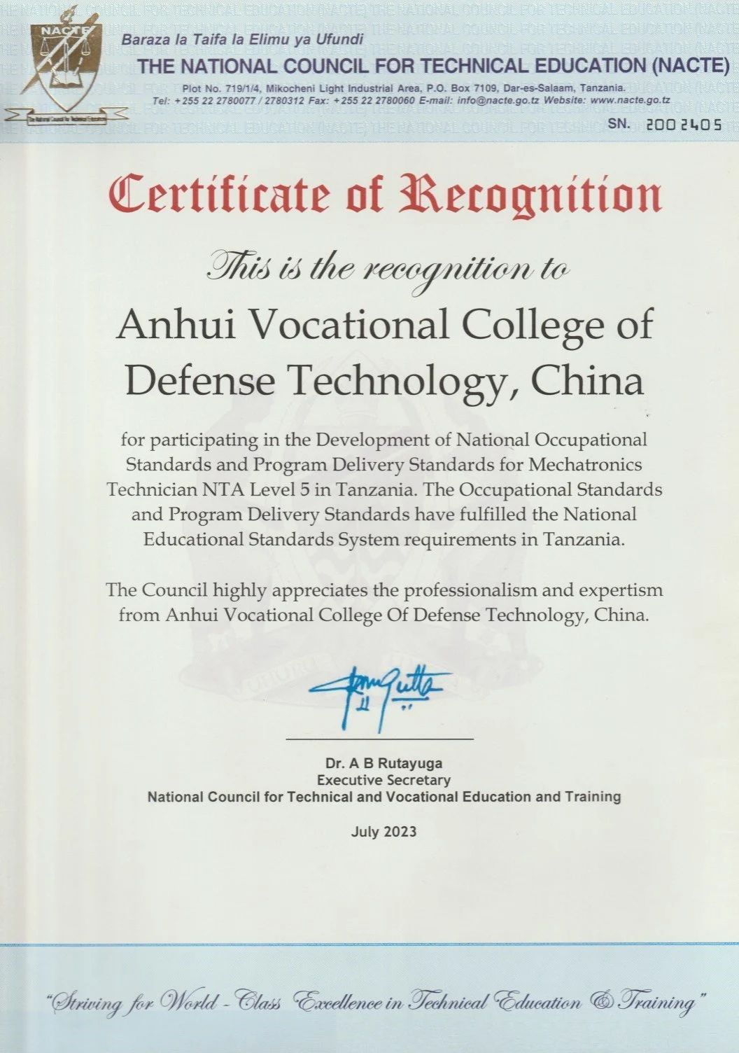 学校于2022年10月成功获批第二批“坦桑尼亚国家职业标准开发项目”立项建设单位。立项以来,学院组建工作专班,多次与坦桑尼亚教育部国家职业教育委员会专家召开工作会议进行深入研讨,认真调研和比对中非职业标准,结合坦桑尼亚实际现状与需求,开发并修订完善了机电一体化技术员5级职业标准以及配套专业教学标准,最终顺利通过坦桑尼亚教育部国家职业教育委员会注册认证并获得官方认证证书,正式纳入坦桑尼亚国家职业教育体系。至此,万象城官网共向坦桑尼亚输出计量员5级和机电一体化技术员5级两项职业标准,进一步提升了学院国际影响力和国际化办学水平。