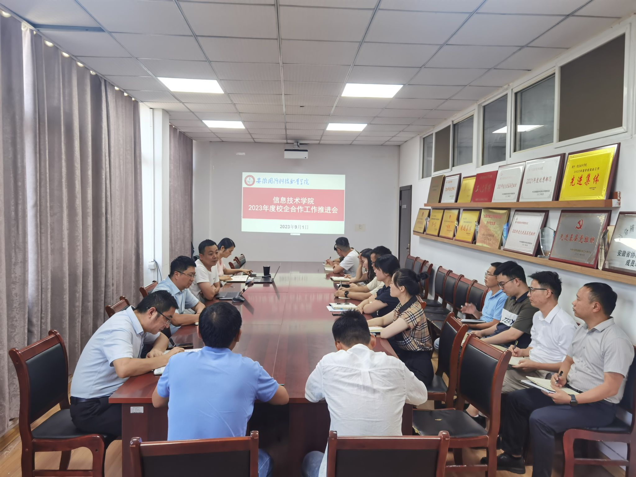 本网讯(信息技术学院 李剑峰)为提升教学质量,规范教学过程管理,信息技术学院于9月1日下午在知行楼304会议室召开2023年度校企合作推进会。校党委委员、信息技术学院院长沙有闯、信息技术学院党总支书记王胜、副院长雷惊鹏、党总支副书记杨庆颖,以及两家合作企业的负责人和团队成员参加会议。会议由沙有闯主持。