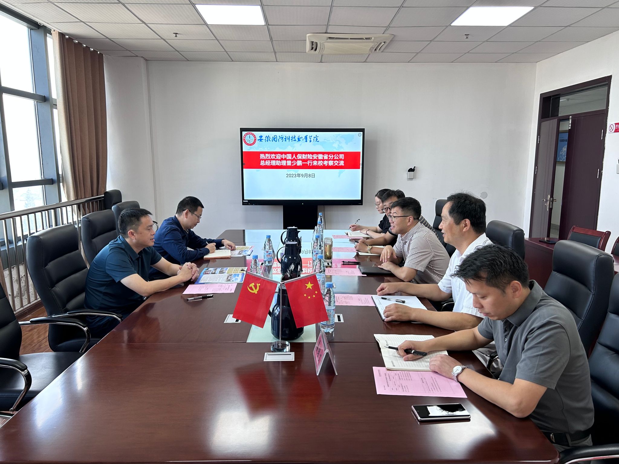 本网讯 9月8日上午,中国人保财险安徽省分公司总经理助理曾少鹏、校企合作专员董超一行来校就校企合作事宜洽谈交流。座谈会在秉心楼会议室召开,校党委委员、副校长李存鹏、汽车技术学院党总支书记兼院长孙良平、党总支副书记余桂刚、副院长姜继文等同志热情接待了来宾。