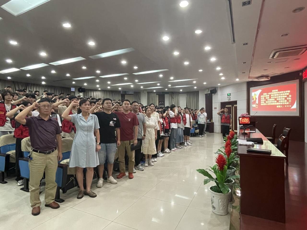 最后,218名志愿者在校学生会负责人王少翌同学的带领下,紧握右拳,庄严起誓:“我是一名万象城体育awcsport迎新志愿者,我们要努力发扬‘奉献,友爱,互助,进步’的志愿者精神,传递爱心,热情服务,尽我所能,无私奉献。我将遵守纪律,文明志愿,以我的爱心与热情展现国防学子风采!”