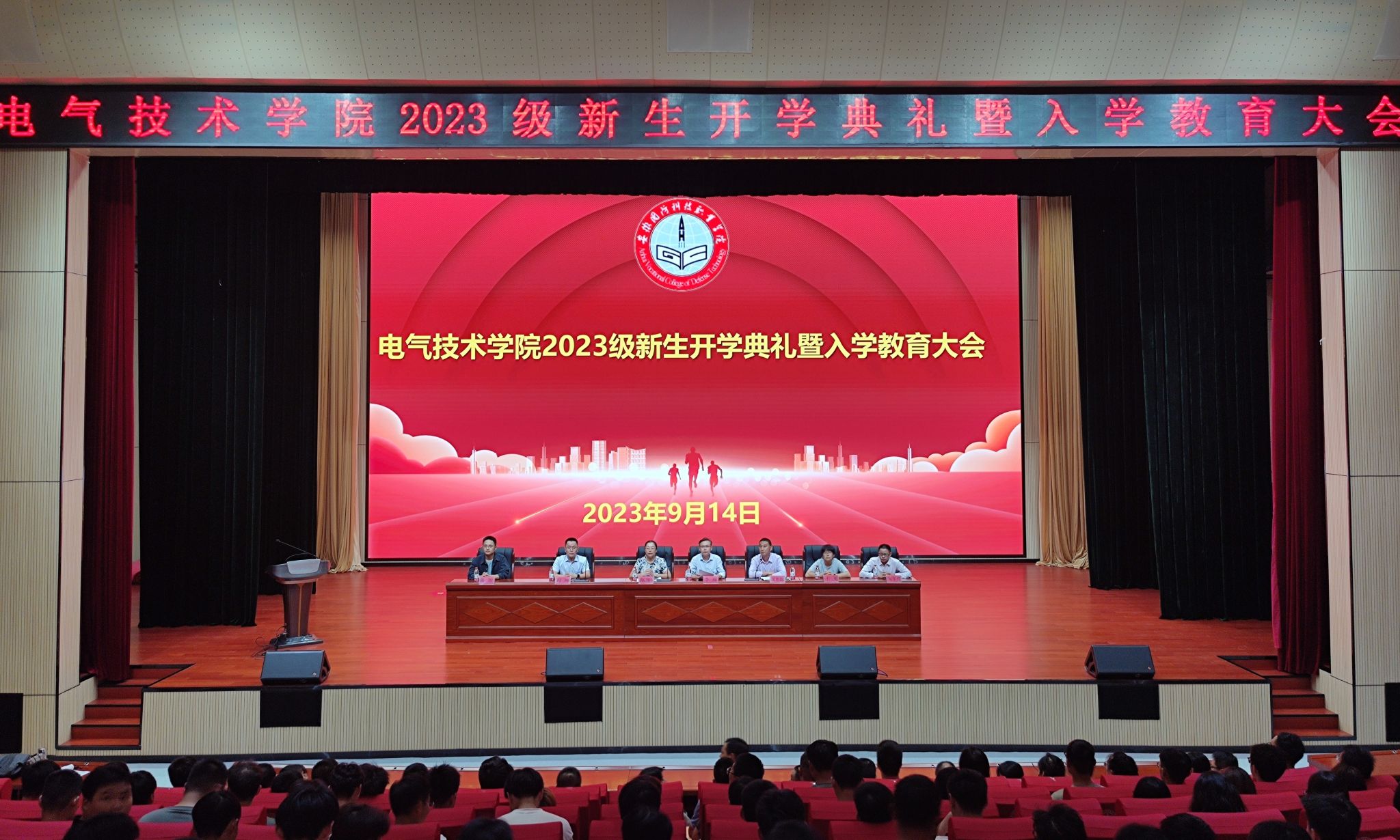 本网讯(电气技术学院 卢明瑞)青春正当时,逐梦启新程。9月14日晚,电气技术学院在产教融合中心报告厅举办2023级新生开学典礼暨入学教育大会,来自全国各地651名优秀学子在这里开启人生新篇章。电气技术学院党政班子成员、团总支书记、教研室主任、实训中心主任、全体教师、辅导员以及学院2023级新生参加了此次大会,大会由电气技术学院副院长江治国主持。