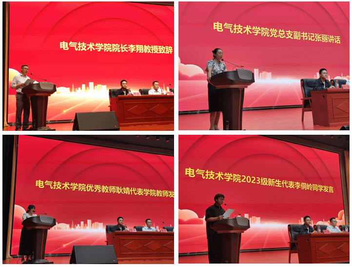 电气技术学院党总支副书记张丽,从进取、友爱、健康、敬畏四个角度,向全体新生传递的家长般的关怀与亲切叮嘱。教师代表耿婧,也对全体新生提出深厚的期望,希望同学们能够养成良好的学习习惯,不断开拓创新,追求卓越。聆听领导、老师们激情洋溢、意味深长的淳淳教导后,来自2023级机电2班的李侗岭同学,代表全体新生发言。他表示,在未来三年学习中,将努力从思考中认识自我,从计划中把握时间,从兴趣中攫取快乐,从实践中赢得价值;在学校“厚德 强能 励志 笃行”校训的引领下,不会忘记自己的初心,将毫不畏惧地迎接未来的挑战,为创造更加灿烂的明天而全力以赴。