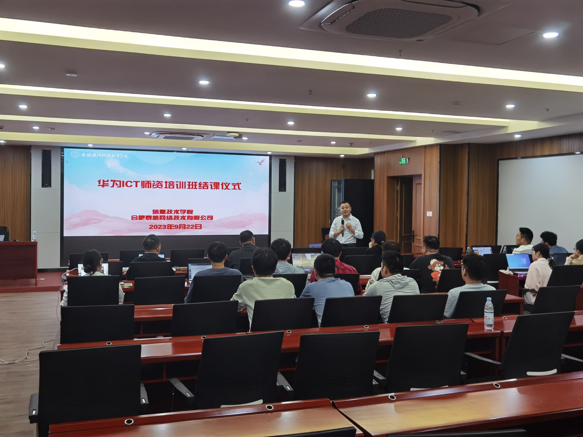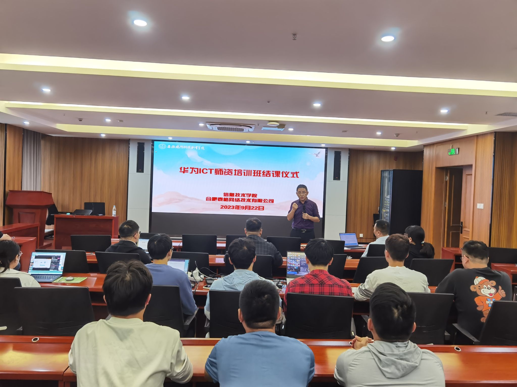 本网讯(信息技术学院 李剑峰)为提高教师的专业素养,促进双师型教师队伍建设,9月18日-22日,信息技术学院在产教融合中心第一报告厅举办了首期华为ICT师资培训班。学院20余名老师和40多名学生参加。此次培训旨在通过集中学习、交流的方式,让参训教师和学生对ICT前沿技术、ICT实践技能有更深的了解,为大家的教学活动提供有力的支撑。