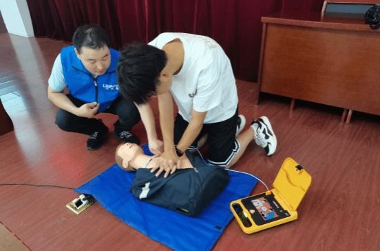 参训师生认真听讲,反应非常热烈,实操演示时气氛尤为活跃,积极上前对“模拟人”进行急救操作,练习使用自动体外除颤仪(AED),在沈老师的指导下,参训人员短时间内掌握了心肺复苏的基本手法和要点,自动体外除颤仪(AED)的使用步骤和注意事项。