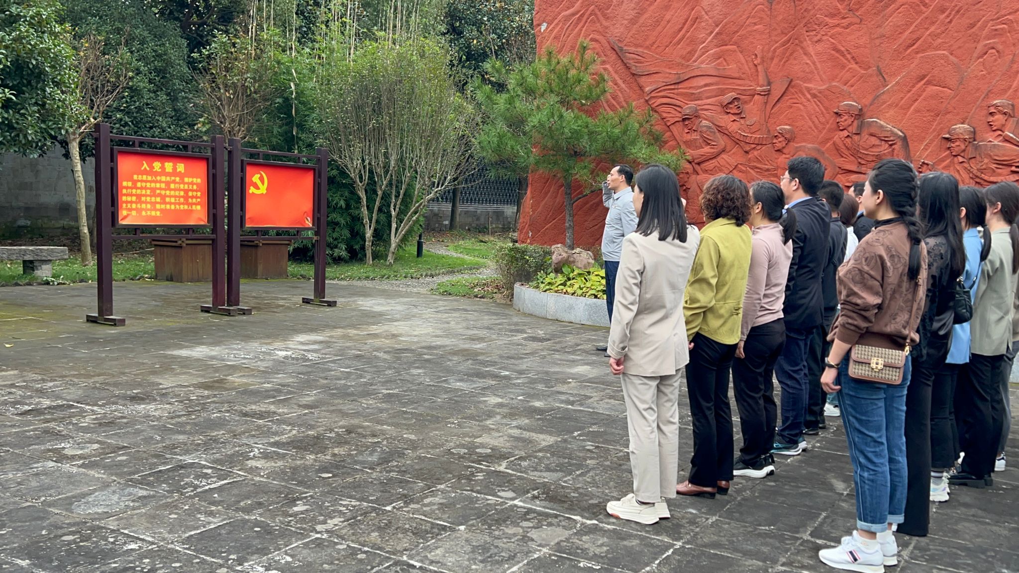 随后,在毛坦厂镇张家店战役纪念馆前,全体党员在刘峰的带领下,面对鲜红的党旗,重温入党誓词。