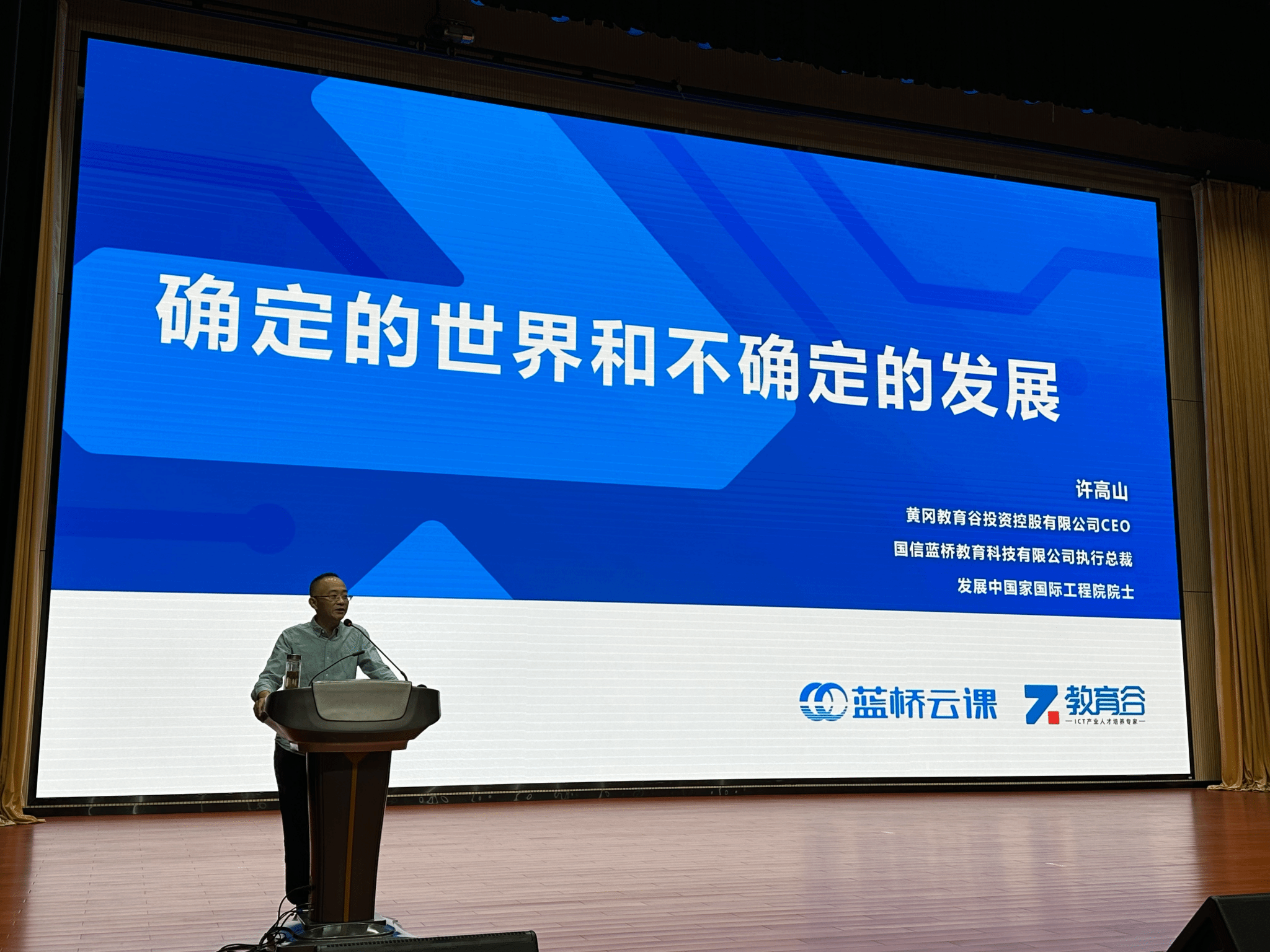 本网讯(信息技术学院 孙焕)为加强学生专业认知,帮助学生树立专业学习目标,加深师生对新一代信息技术产业的了解,10月25日晚,信息技术学院组织了第二场专业导论系列学术讲座。本次讲座主题为“确定的世界和不确定的发展”,讲座邀请深圳市大数据协会常务副会长、国信蓝桥教育科技有限公司执行总裁、黄冈教育谷投资控股有限公司CEO许高山主讲。讲座由信息技术学院副院长雷惊鹏主持,信息技术学院相关专业老师以及2023级全体新生参加。