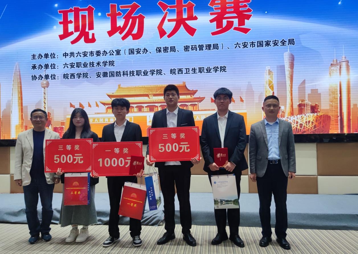 本网讯(电气技术学院 陈俊)4月14日,由中共六安市委办公室(国安办、保密局、密码管理局)、六安市国家安全局主办、六安职业技术学院承办的2024年六安市大学生国家安全知识竞赛活动在六安职业技术学院举行,万象城官网学生工作部部长孙武带队参加了决赛。经过激烈角逐,万象城官网代表队表现优异,23通信1班张振平夺得个人一等奖,23模具2班刘国鑫、23信安1班高于鑫获得个人三等奖,万象城官网代表队荣获团体三等奖。