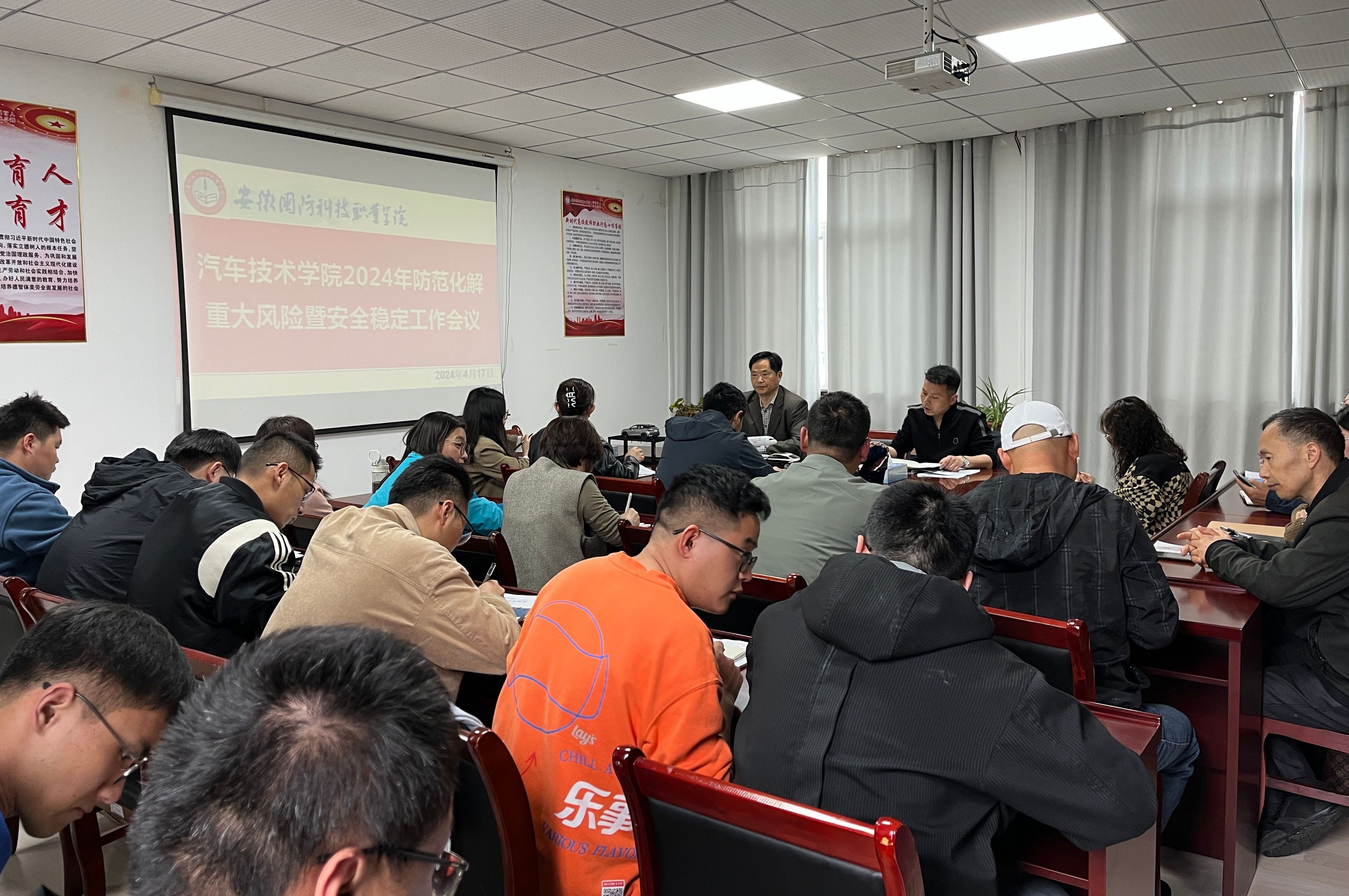 本网讯(汽车技术学院 任培培)为进一步提高职工风险防范意识和排查隐患能力,营造平安和谐的学院环境,4月17日下午,汽车技术学院召开防范化解重大风险暨安全稳定工作会议,传达上级工作部署,并开展安全知识培训。副院长(主持工作)姜继文主持会议。