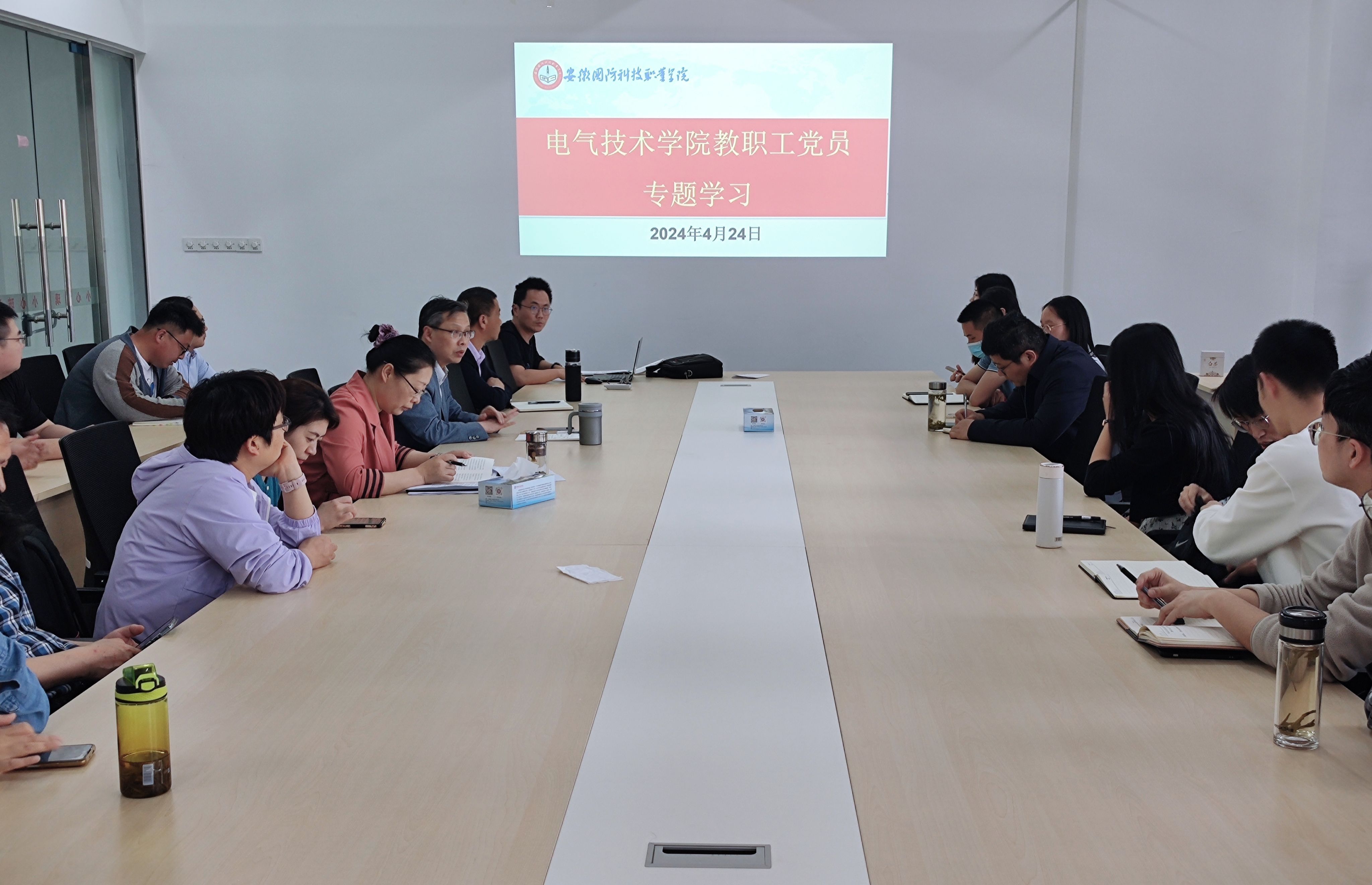 本网讯(电气技术学院 卢明瑞)为强化党员党性修养,贯彻落实“进一步厉行节约,坚持过紧日子思想”,4月24日下午,电气技术学院于产教融合中心三楼会议室召开全体教职工党员专题学习会。学院全体教职工党员参加会议,会议由电气技术学院院长李翔主持。