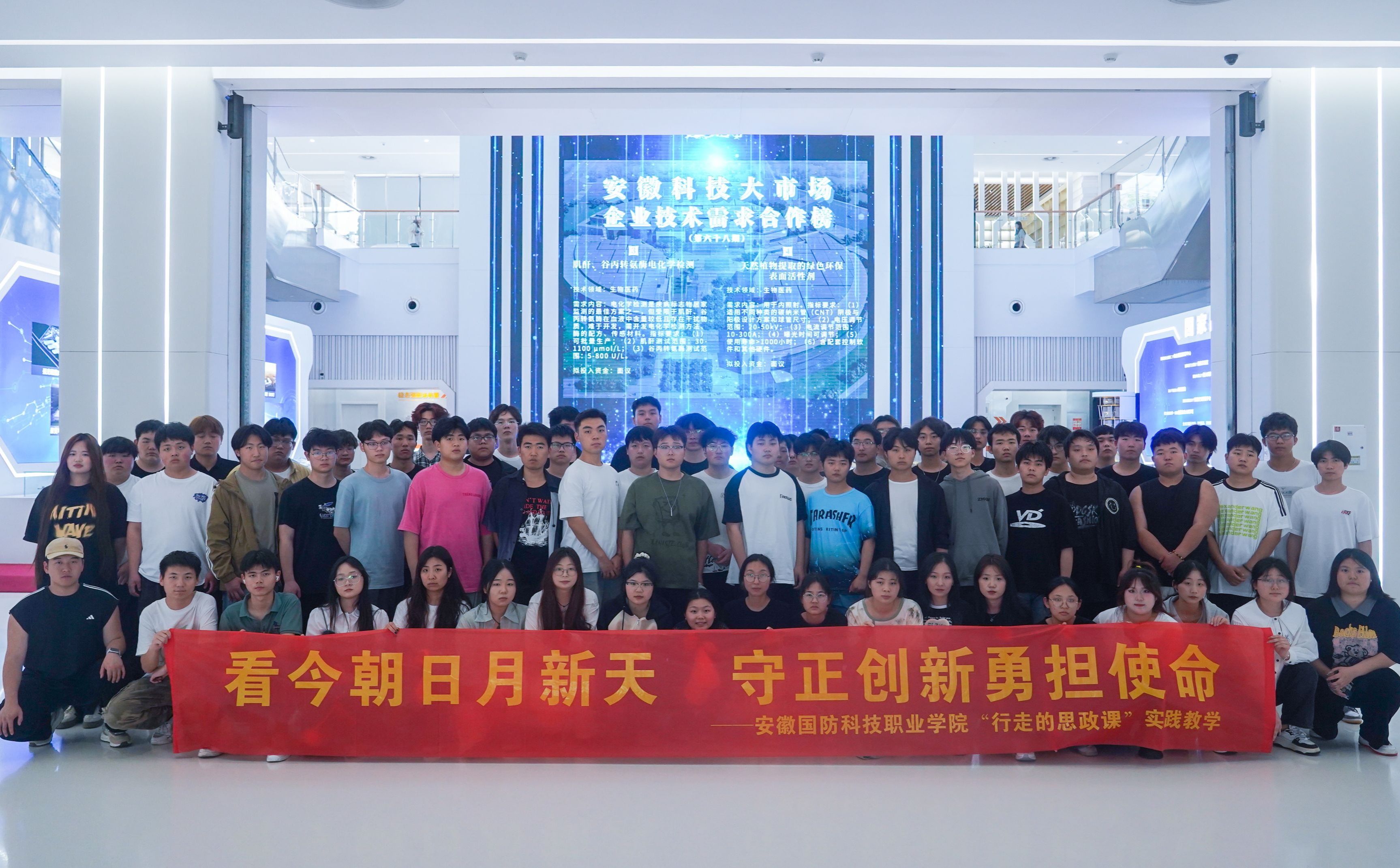 “行走的思政课”第二站——安徽创新馆。安徽创新馆作为全国首座以创新为主题的场馆,成为了全国具有重要影响力的科技大市场。同学们在工作人员的带领下进入了场馆,满满的科技感瞬间震撼了现场的师生。师生们首先在时间轴的带领下,了解了世界三次工业革命,在墙上的时间轴下面,还陈列着每个时期的标志性科技产品。蒸汽机、发电机、内燃机、卫星、电子计算机……一个个仿真的模型直观地呈现在大家面前。