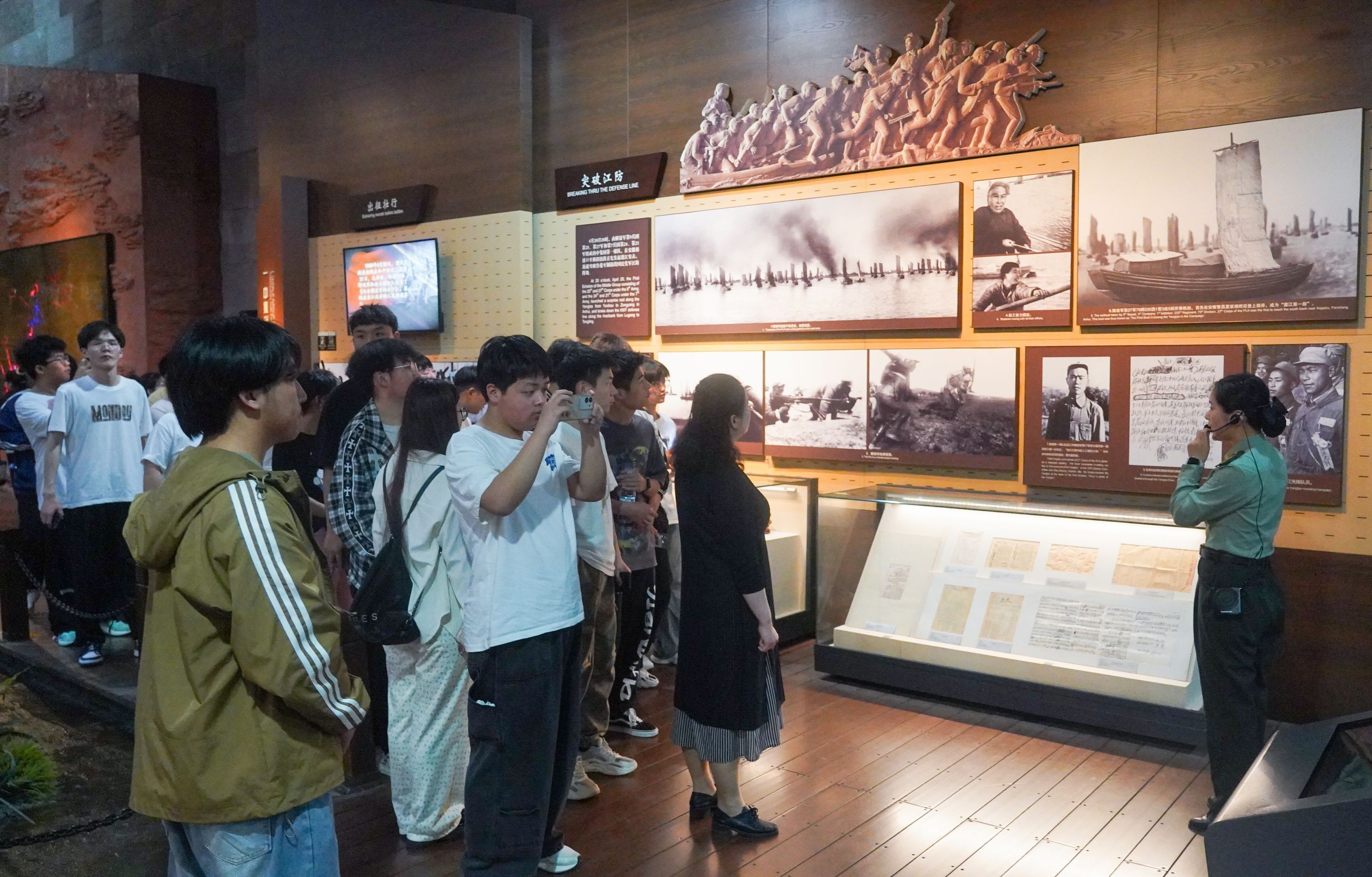 一进入纪念馆,一种沉重而庄严的气氛扑面而来。展馆内部布局有序,从战争背景到战役经过,再到历史影响,每一个展区都为我们展现了那段血与火的历史。一件件革命文物,诉说着一段段直抵人心的红色记忆,一个个继往开来的历史瞬间又一次在心间被定格,师生们感受着当年战争的惨烈和英勇。渡江战士们无畏牺牲精神、“七一”勋章获得者、渡江战役一等工程马毛姐的故事、一封封饱蘸家国情怀的书信令师生们深感震撼。