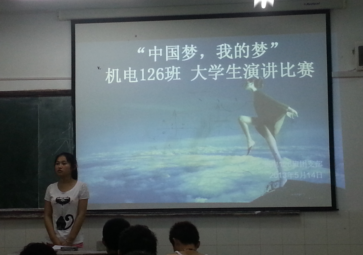 5月14日晚,机电工程系2012级各班级认真组织开展了以《中国梦,我的梦》为主题的大学生演讲比赛。各班级参赛选手紧紧围绕演讲主题,向我们展示了中华民族的美好未来和自己的伟大理想。