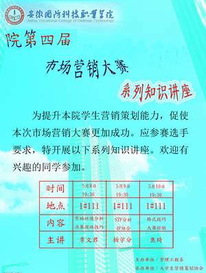 5月8日-10日晚上,营销专业骨干教师李文君、杨学分及参加省技能大赛的焦琦同学分别在1栋111举办了院营销大赛知识讲座,各系参加大赛的学生听取了讲座。该大赛是由管理工程系主办、营销策划协会协办的。