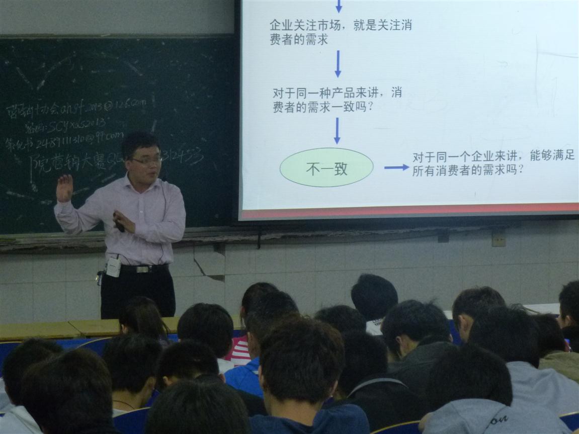 李文君老师为大家介绍市场坏境分析和活动方案及模拟促销,杨学分老师为大家介绍了STP战略和4P分析及讲解了2012年全国营销大赛一等奖的PPT案例,焦琦同学为大家介绍策划书写作格式及大赛临场发挥的一些技巧。