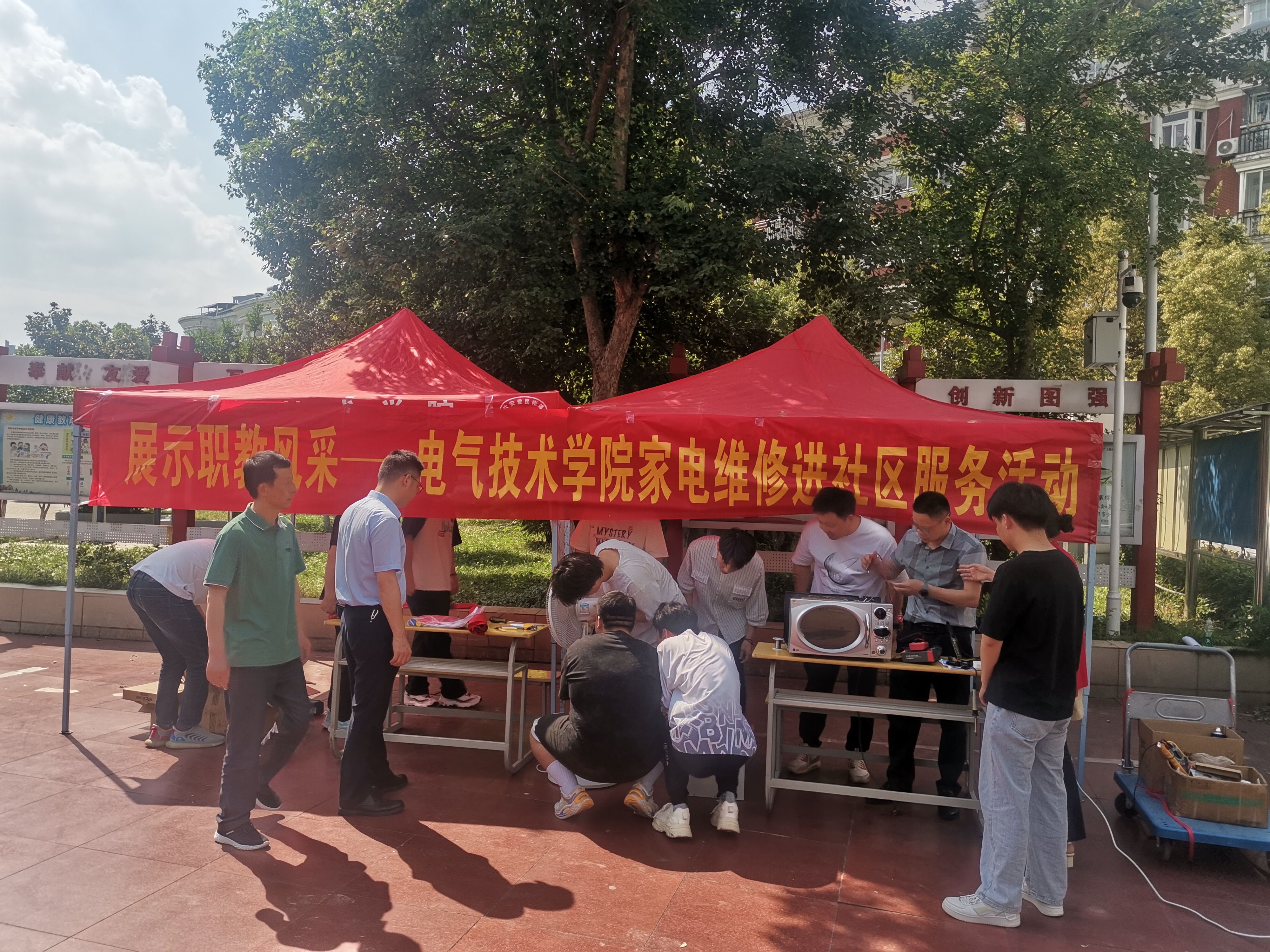 本网讯(电气技术学院 江治国)为深入学习贯彻党的二十大精神,认真落实《中共安徽省委安徽省人民政府关于加快职业教育改革发展服务现代化美好安徽建设的意见》,喜迎新中国成立75周年,大力宣传劳模精神、劳动精神、工匠精神,弘扬劳动光荣、技能宝贵、创造伟大的时代风尚,5月22日,学院组织师生走进春江-河滨花园社区,充分发挥专业特长,开展家用小电器维护、维修及夏季安全用电宣传活动。