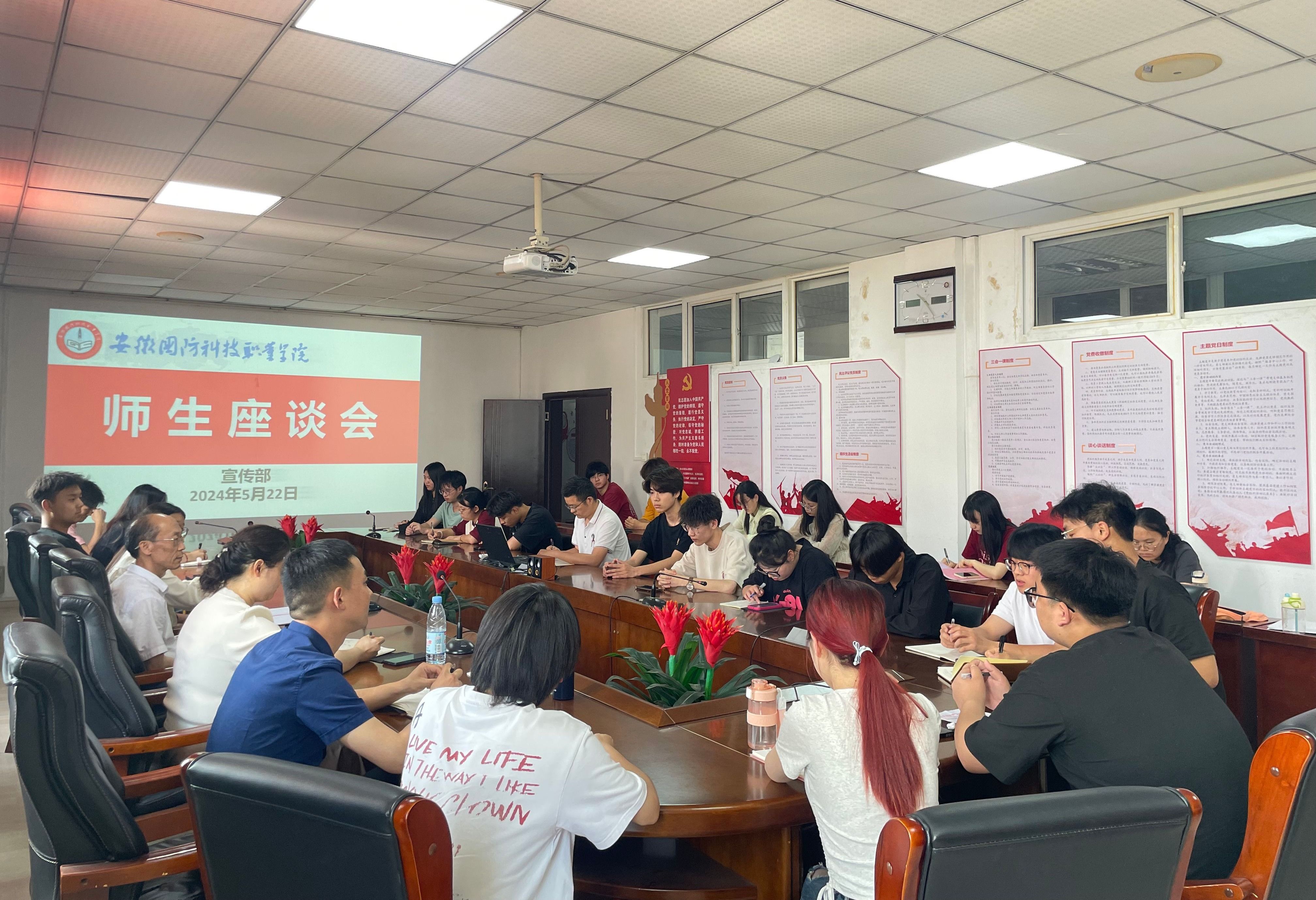 本网讯(马克思主义学院 熊美艳)为深入了解学生课程学习效果和学习诉求,落实“以学生为本”的教育教学理念,进一步增强教学质量和教学管理工作的针对性和实效性,以及丰富学校对外窗口的内容和形式,5月22日,马克思主义学院联合宣传(统战)部在马克思主义学院403会议室召开了2023-2024第二学期师生座谈会。座谈会由校党委委员、宣传(统战)部部长、马克思主义学院院长陈思主持,马克思主义学院党总支书记黄祥出席会议并讲话,马克思主义学院副院长聂勇、宣传(统战)部副部长朱其阳、马克思主义学院各教研室主任、教师代表以及学生代表共同参加。