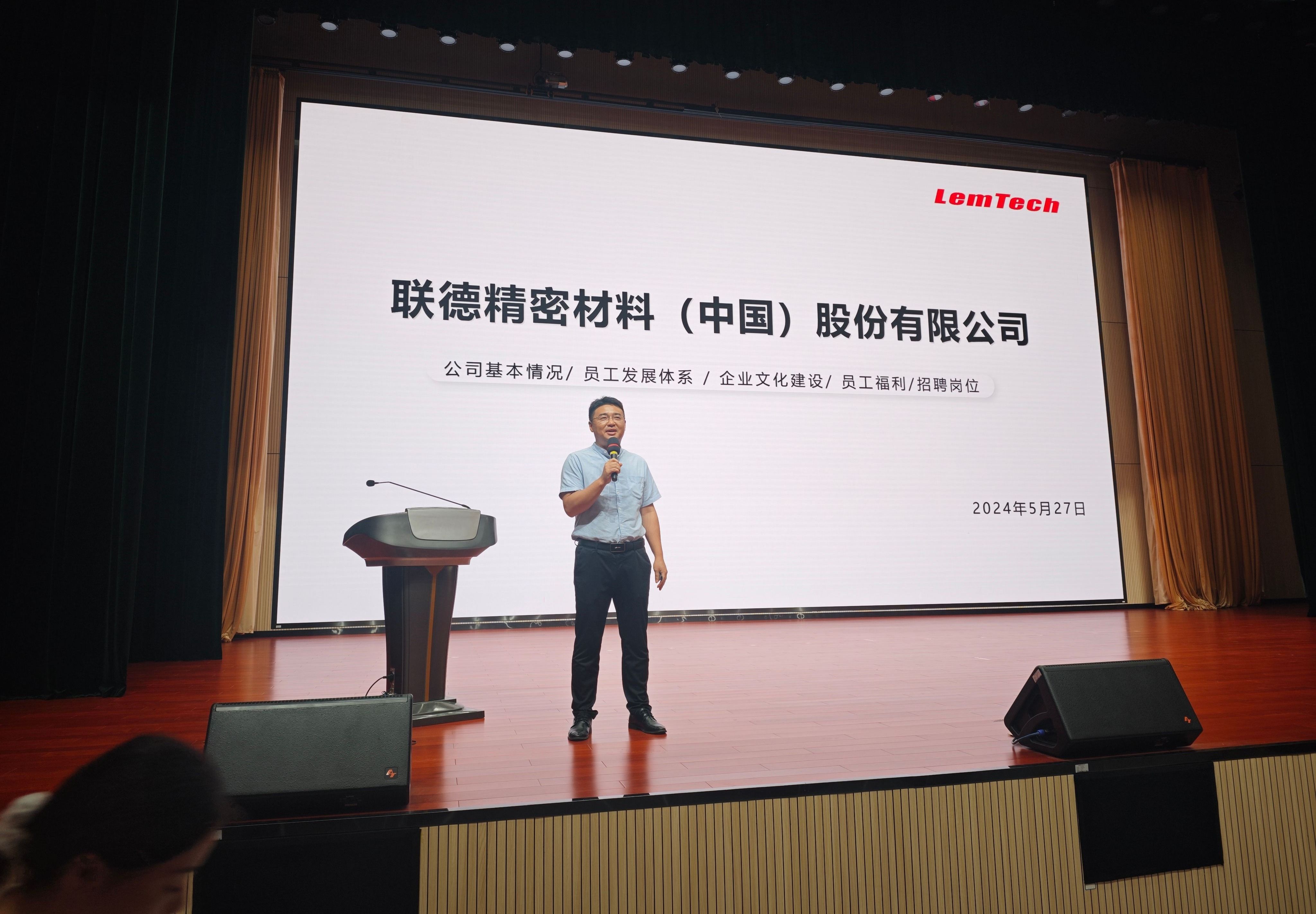 实习动员会结束后,合肥合光精密仪器有限公司、联德精密材料(中国)股份有限公司两家与我院校企合作单位的人事部门负责人分别进行了企业宣讲。他们围绕企业概况、实习岗位、薪资待遇、职业规划以及内部发展等向同学们全方位地展示了企业整体形象、岗位工作环境和晋升发展路径。