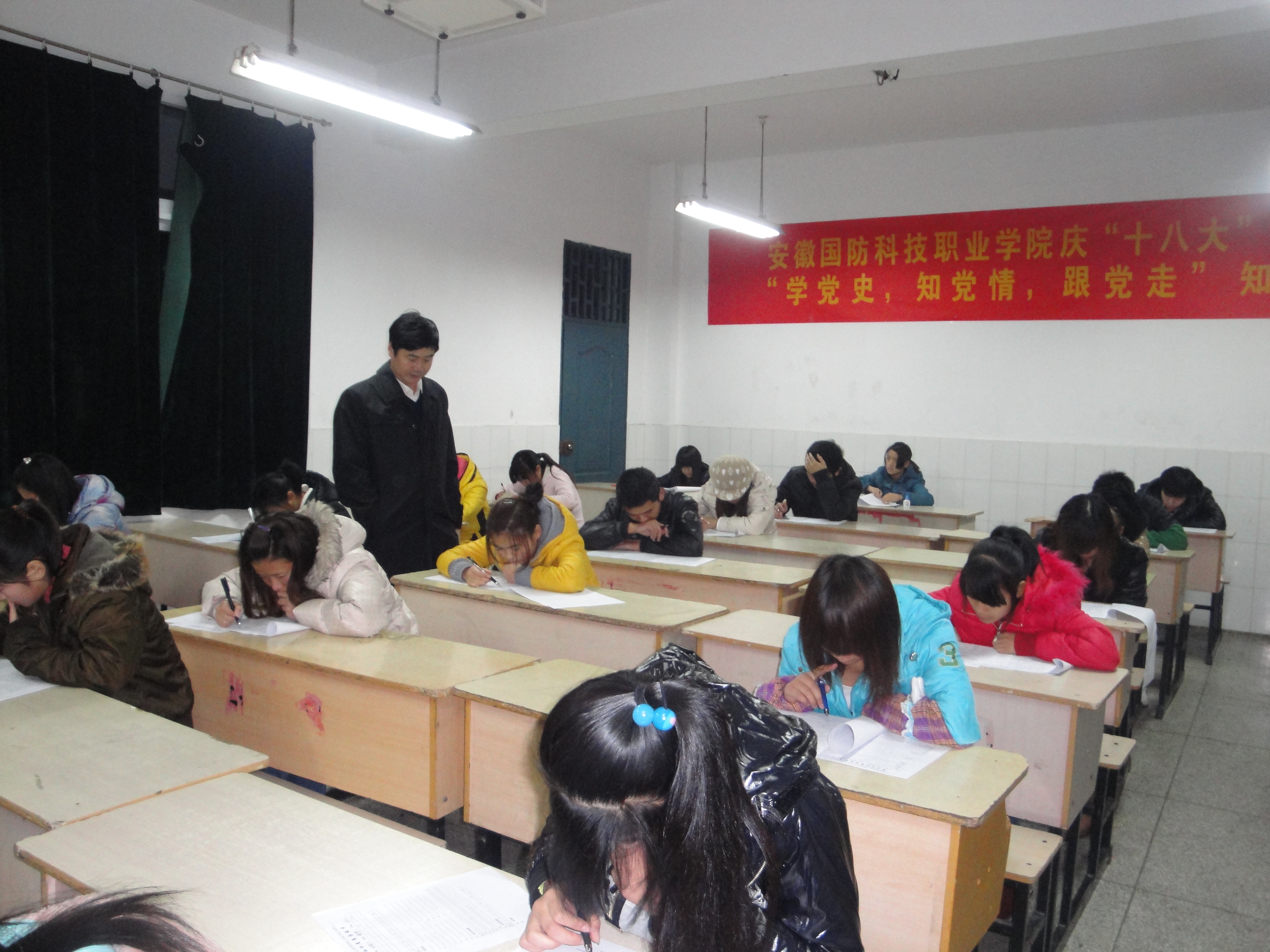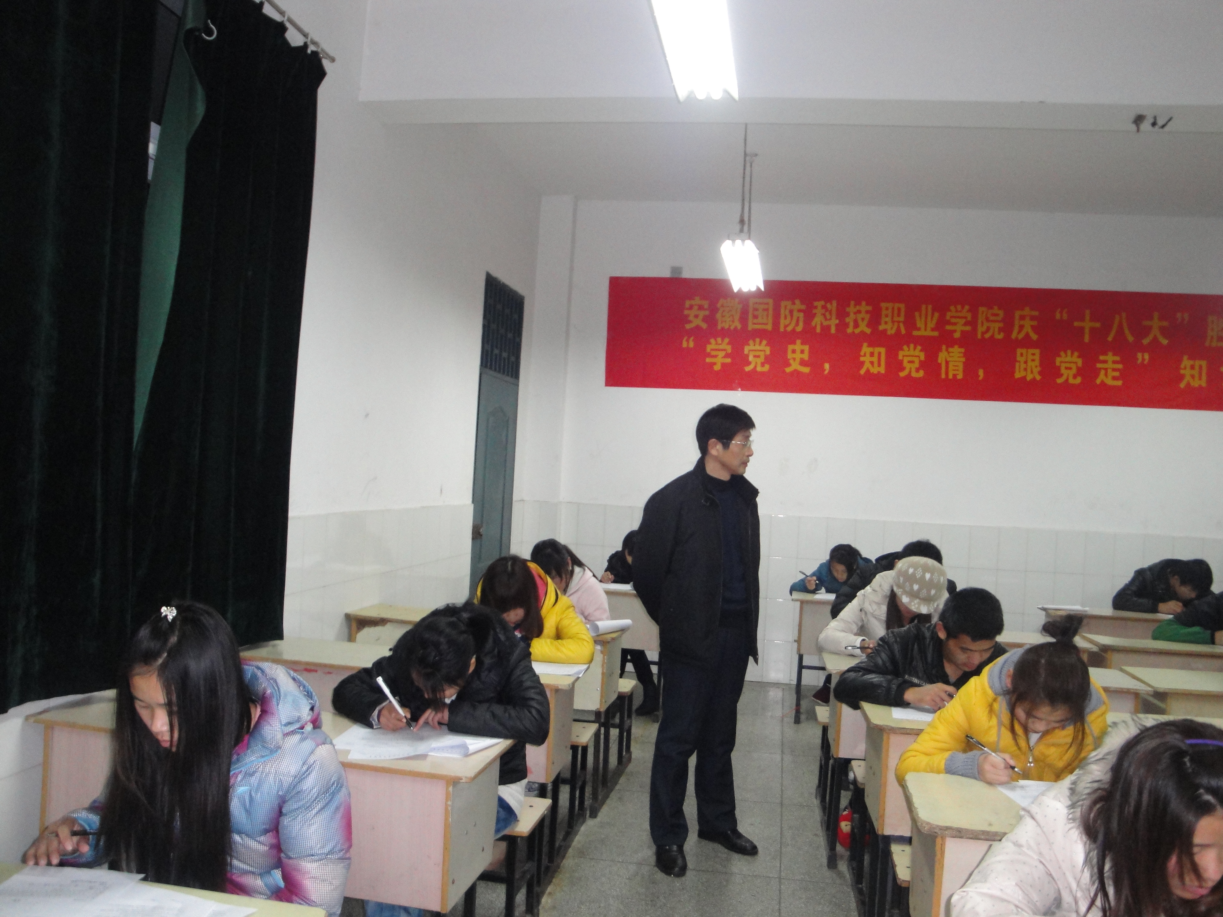 为庆祝中国共产党第十八次全国代表大会的胜利闭幕,加强广大学生对党的认识,由思政部主办的主题为“学党史·知党情·跟党走”的党史知识竞赛考试于11月30日晚在2号教学楼顺利进行。学院党委书记余嗣元、纪委书记朱德明亲临考场进行了巡查。