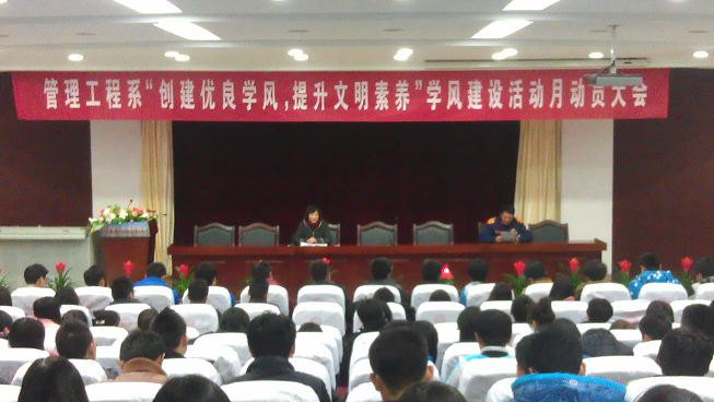 11月23日管理工程系在图书馆报告厅成功召开了“创建优良学风、提升文明素养”学风建设月动员大会。出席会议的有管理工程系主任辅导员张圣霞老师、10级辅导员丁辉老师及各班主要班干共约140人。