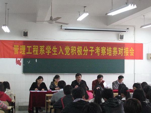 10月24日下午,管理工程系在2教210教室召开学生入党积极分子考察培养对接会。系领导张显国、杜先扬、刘圣春出席会议,会议由学生党支部书记李文君主持,系全体教师党员和学生入党积极分子参加会议。