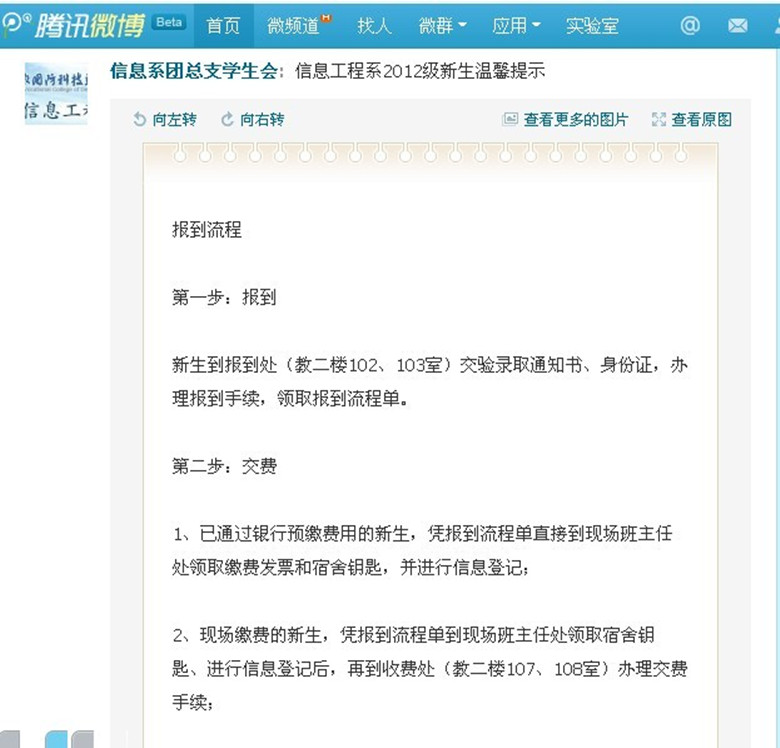 三是系团总支积极行动,配合做好迎新准备。为做好迎新工作,系团总支对参加迎新工作的学生志愿者进行了集中培训,对礼仪、安全、登记注册各项事务进行了详细的指导,确保各环节衔接紧密、万无一失。此外,系团总支积极行动,为每位新生准备了班主任联系卡,并发出微博,提醒新生报到流程,彰显人文关怀;制作迎新横幅、系情介绍和各专业宣传板块,开展跨年级互助活动,帮助新生尽快熟悉校园、适应大学生活。