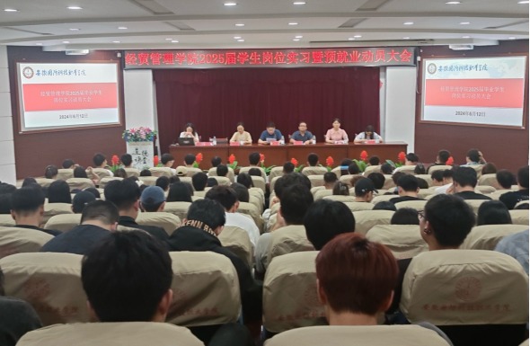 本网讯(经贸管理学院 张兰)为落实学校相关文件要求,进一步做好经贸管理学院2025届学生岗位实习工作,6月12日晚,经贸管理学院在图书馆报告厅隆重召开2025届学生岗位实习动员暨预就业和安全教育大会。学院院长杨力、副院长杨学分、2022级全体辅导员及相关专业学生参加了此次会议,会议由黄惠主持。