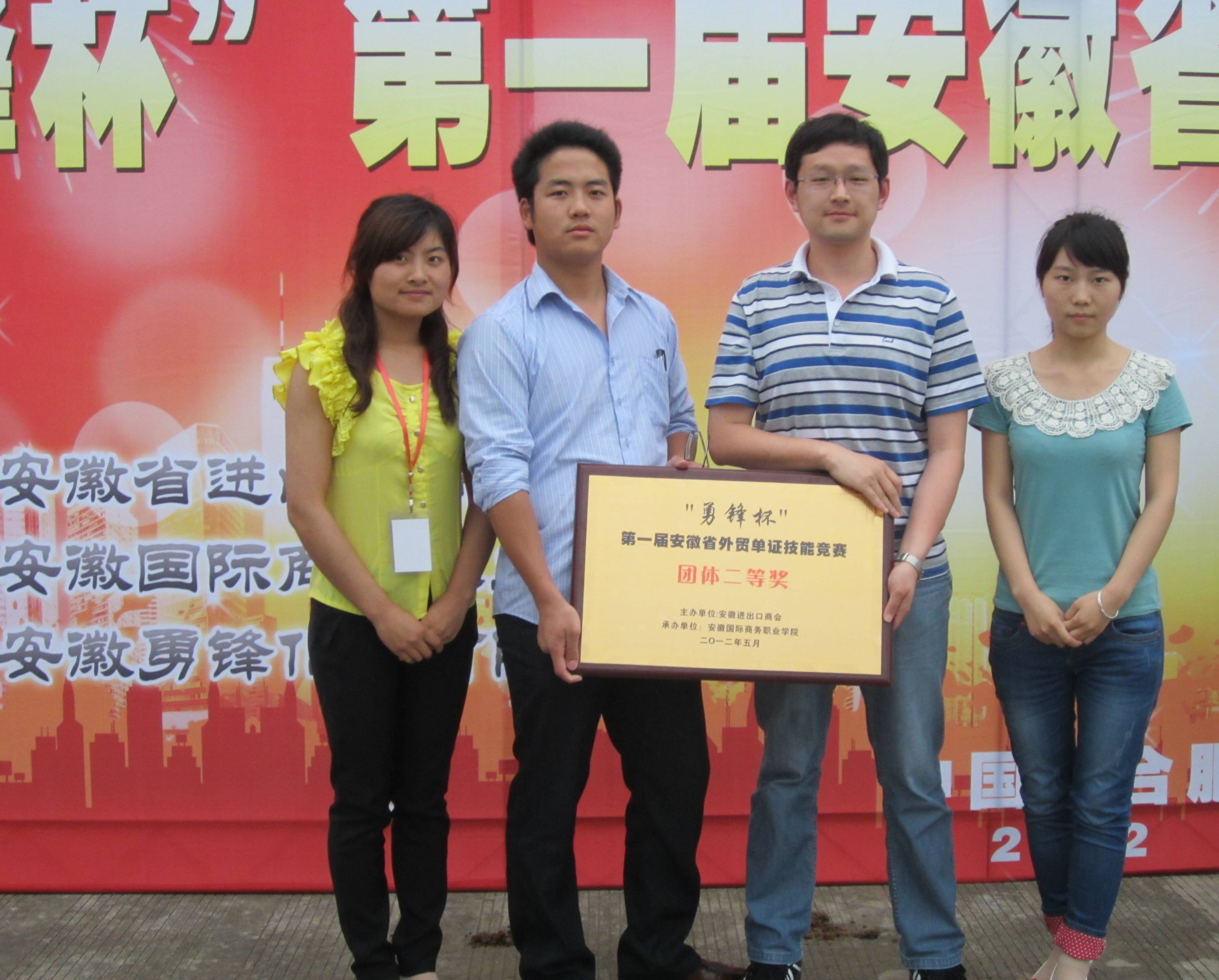 5月18日、19日,2012年 “勇锋杯”第一届安徽省外贸单证技能竞赛在安徽国际商务职业学院举行。由汪巍老师指导,刘亚运、马瑶、于蕊3位同学组成的代表队参加了该项竞赛。在两场紧张比赛中,参赛选手们沉着冷静、积极应战,展示了精湛的专业技能和良好的团队协作精神,经过奋力拼搏,夺得团体二等奖,同时于蕊还获得个人二等奖,马瑶获得个人三等奖的好成绩。