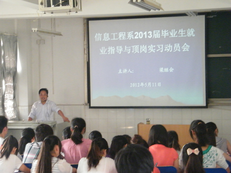 为做好2013届毕业生“2+1”专业的就业指导工作,5月11日下午信息工程系面向计算机应用技术、图形图像制作两个专业的全体学生,在2#105召开了“2013届毕业生就业指导与顶岗实习动员会”,大会由系党总支书记梁继会主讲,2013届各班班主任参加大会。