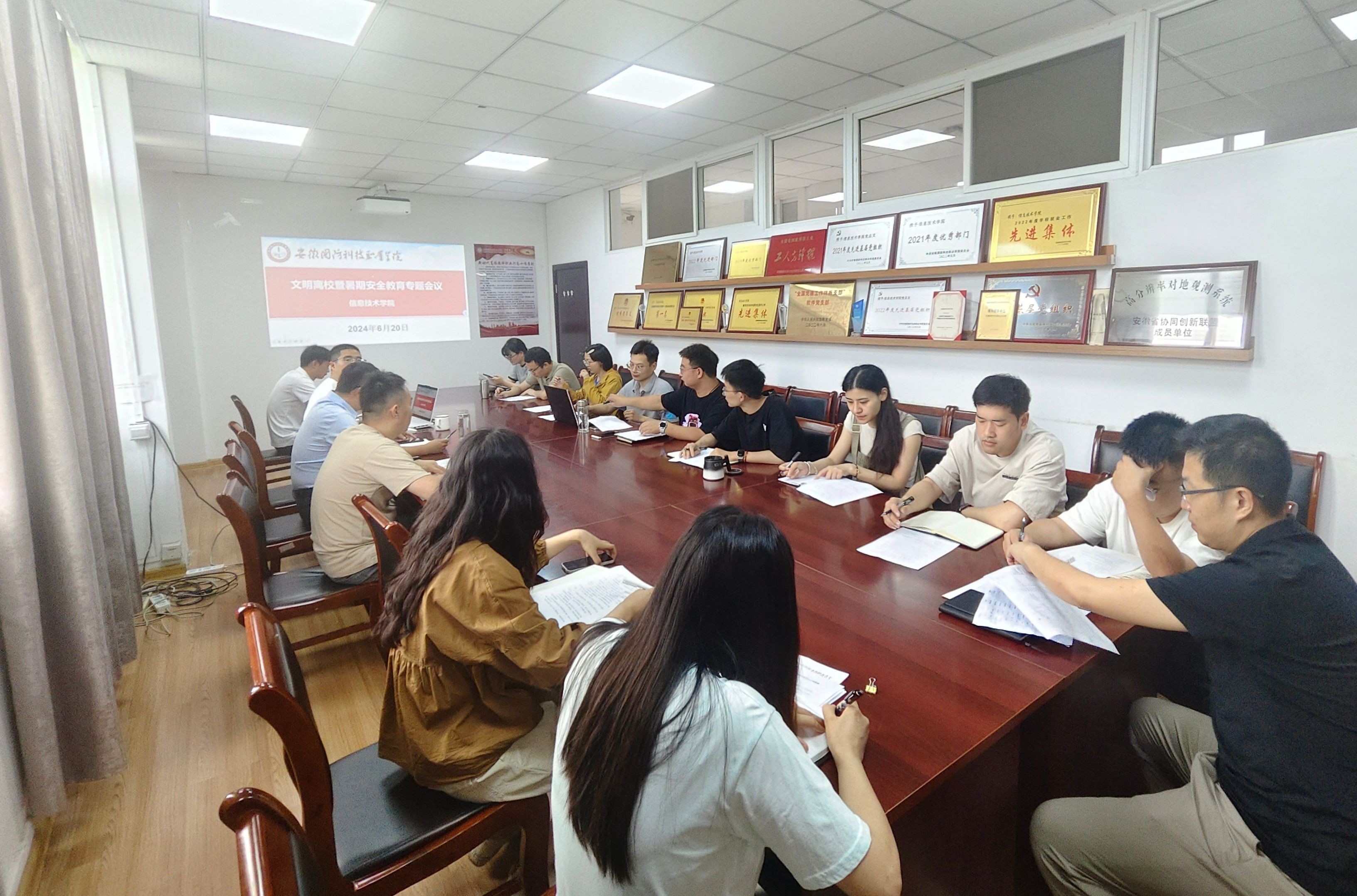 本网讯(信息技术学院 严晓曼)为进一步做好暑假前学生的安全管理工作,确保学生文明、安全、和谐、有序离校过暑假。6月20日上午,学院组织召开文明离校和暑期安全教育专题辅导员会议,学院党总支书记王胜、党总支副书记杜洪宇,全体辅导员参加会议。