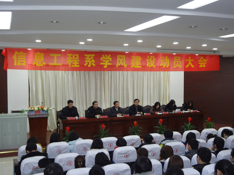 3月7日下午,信息工程系在报告厅隆重召开2012年学风建设动员大会,会议由系团总支书记张伟业主持。系党总支书记梁继会、系主任黄存东与系学生工作人员出席了大会,在校学生干部与各班级班干、寝室长参加了大会。