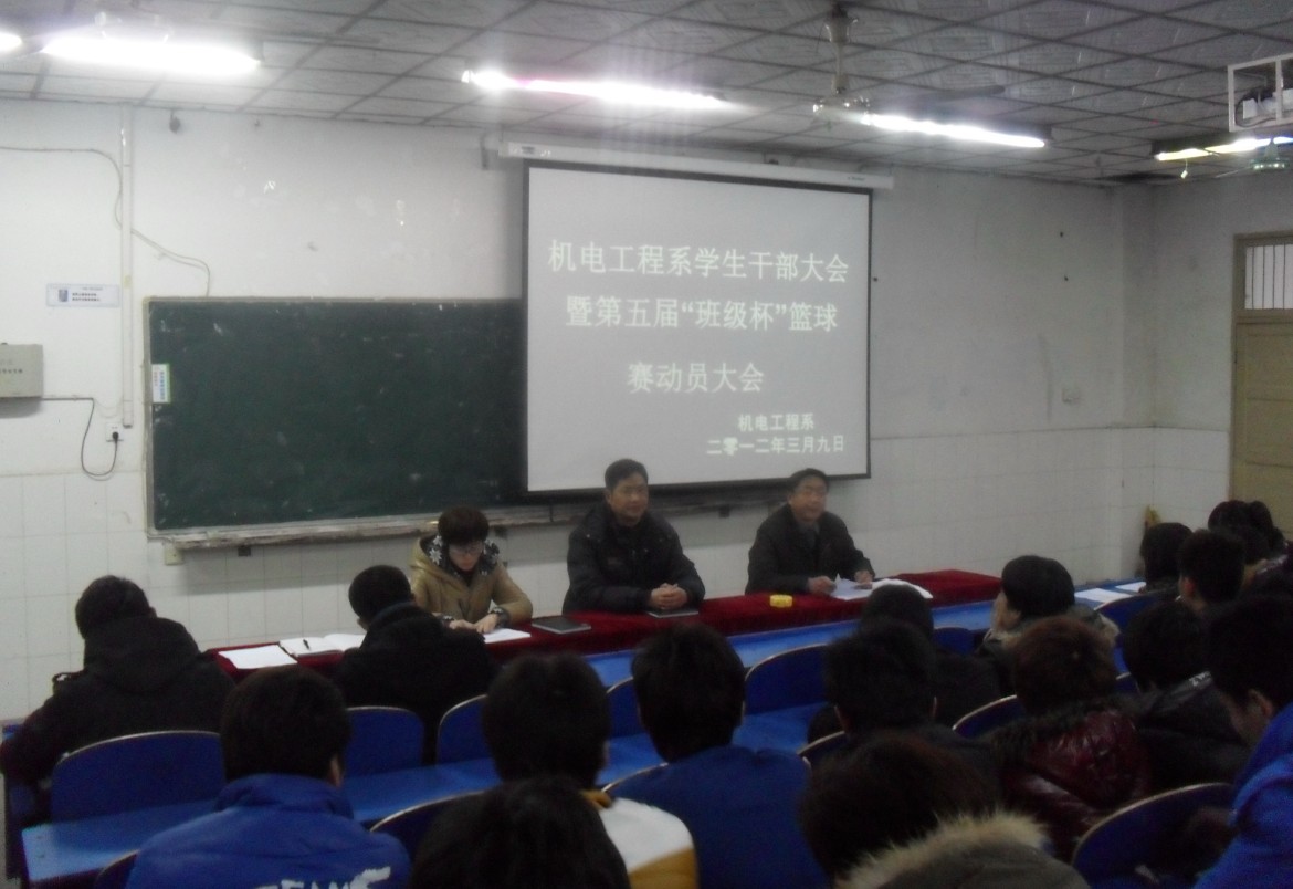 3月9日,机电工程系学生干部大会暨第五届“班级杯”篮球赛动员大会在一栋教学楼111教室举行。系党总支书记孙良平、副书记叶启衡、团总支书记刘严出席了大会,系属各班班长、体育委员及学生会全体成员参加了此次大会。