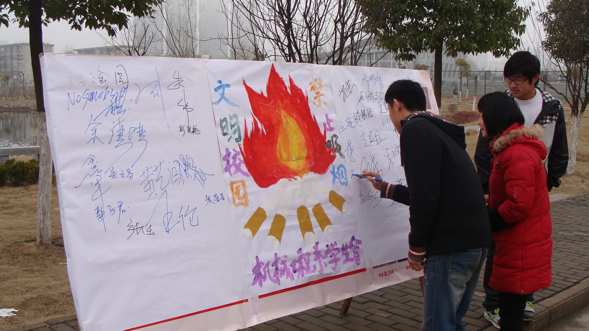 3月2日,机械工程系在食堂门口举办“文明校园,禁止吸烟”的活动,活动中,同学们纷纷在活动宣传板上签名,一起宣扬无烟校园。