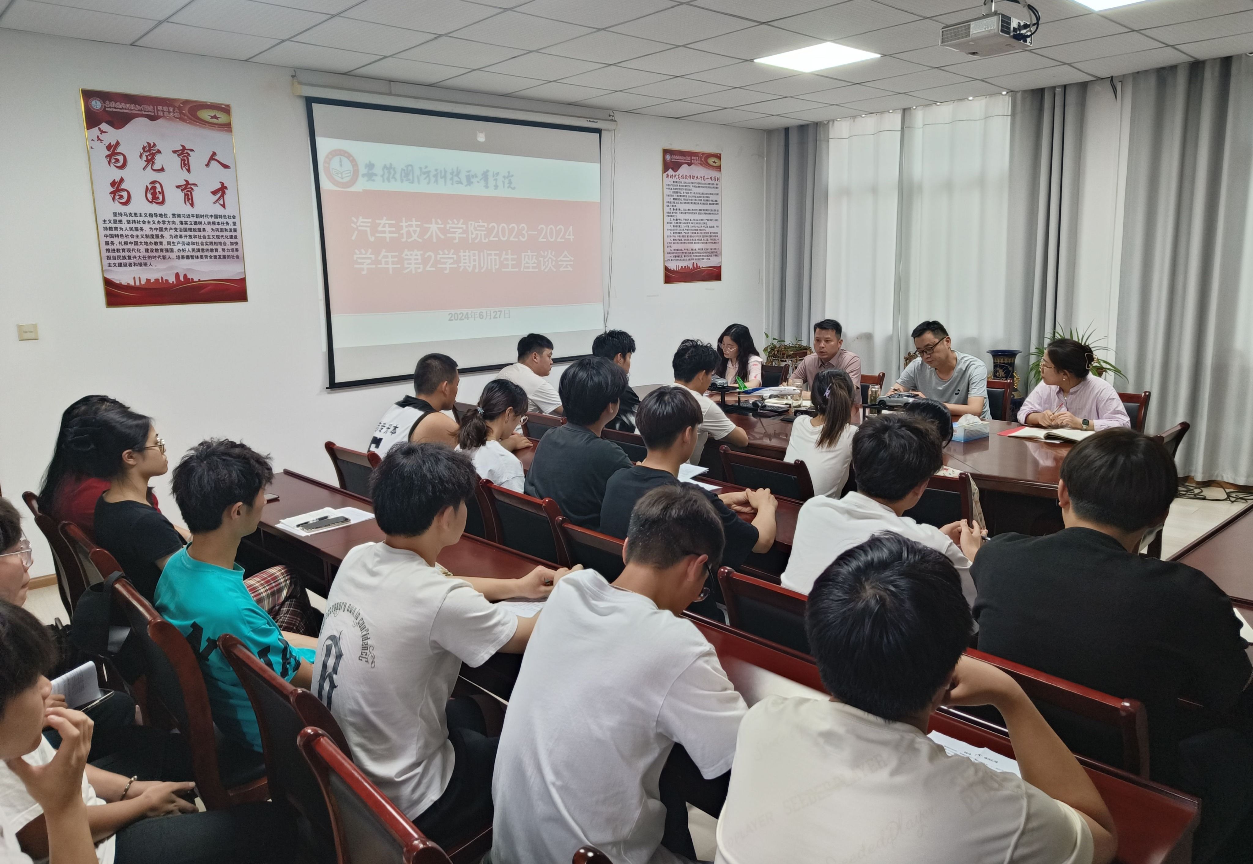 本网讯(汽车技术学院 任培培)为充分了解广大学生对学院教育教学、管理服务等方面的意见和建议,进一步增强汽车技术学院教学管理服务工作的针对性和实效性,切实提高教学管理服务水平和教学质量,6月27日下午,汽车技术学院召开2023-2024学年第二学期师生座谈会,学院党政办班子主要成员与各班学生代表畅谈交流。副院长(主持工作)姜继文主持会议。