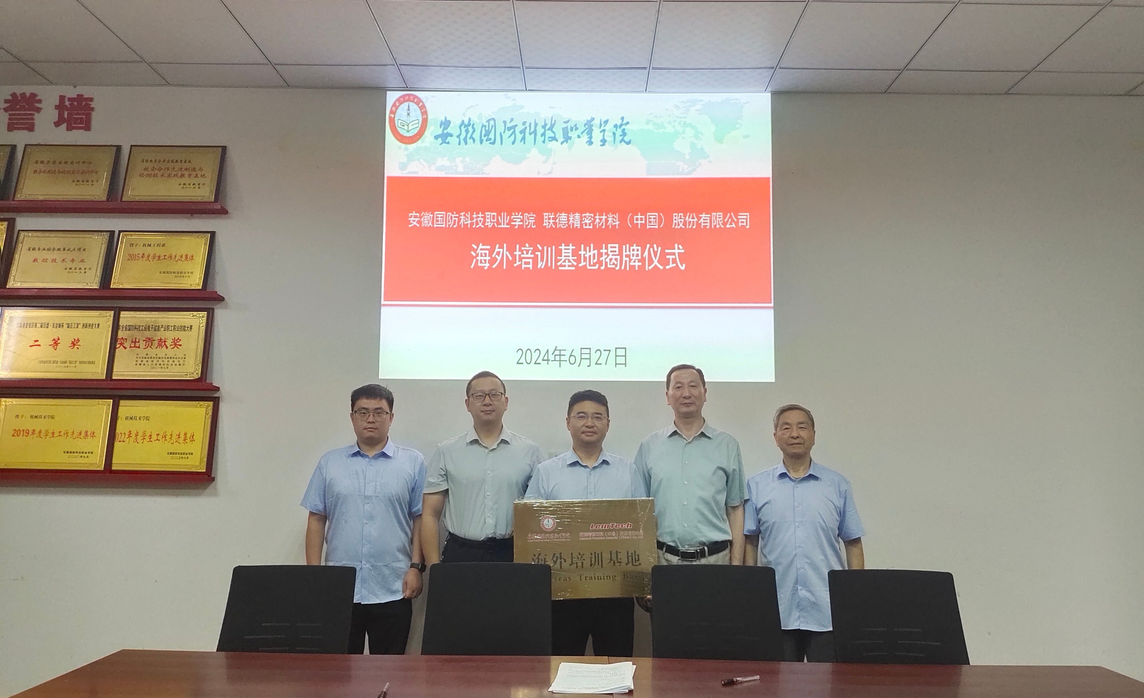 本网讯(机械技术学院 吴天跃)6月27日下午,机械技术学院与联德精密材料(中国)股份有限公司隆重举行“海外培训基地”揭牌仪式,仪式在知行楼120会议室举行。党政办主任李大武、联德公司管理部经理康世杰等领导出席了此次活动,活动由机械技术学院副院长熊良平主持。
