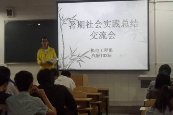 为进一步巩固和扩大暑期社会实践活动成果,让更多的同学了解社会实践、投身社会实践、取得更好的实践成绩,10月14日晚机电工程系团总支组织各班级参加社会实践的学生代表在2教208教室召开了“2011年暑期社会实践总结交流会”活动。此次交流会以“实践归来话成就,交流探索谱新篇”为主题,采取经验介绍和问答交流的形式开展。