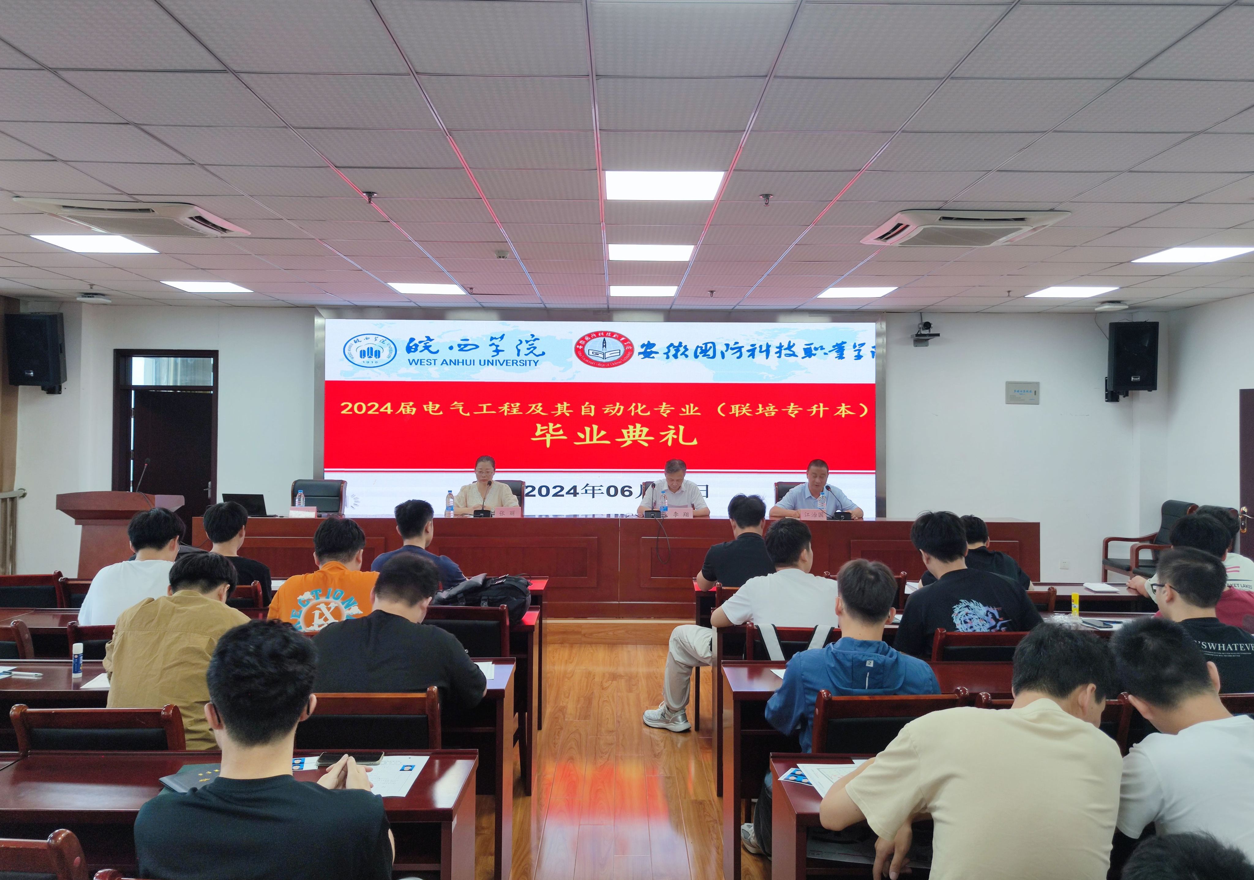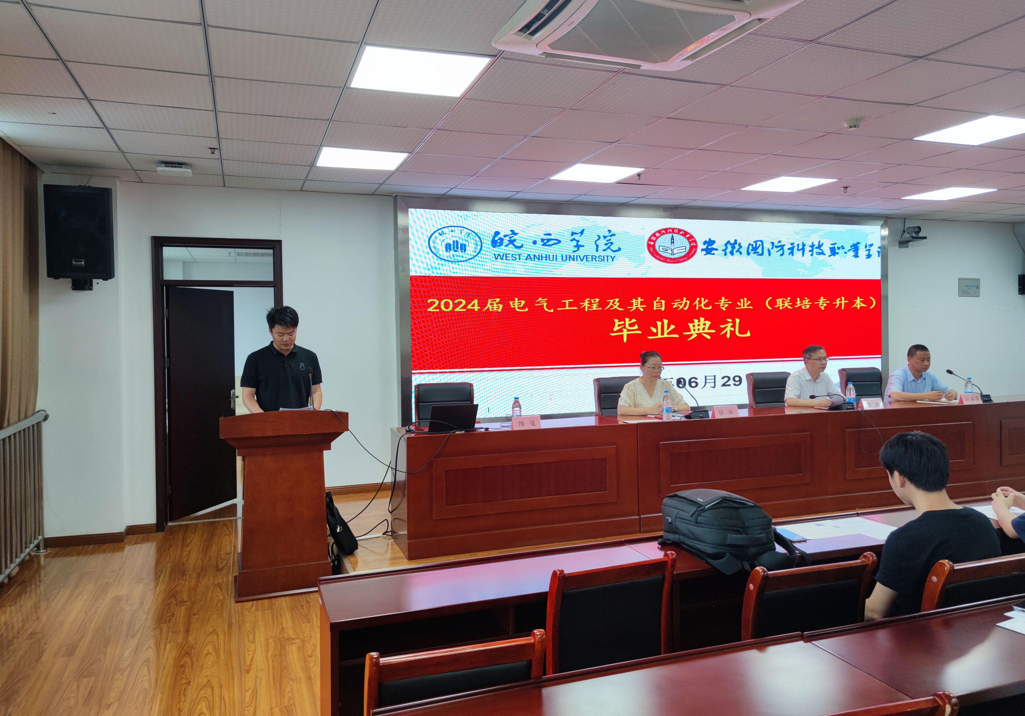 本网讯(电气技术学院 程坤)6月29日上午,皖西学院与万象城体育awcsport专升本联合培养电气自动化技术专业 2024 届毕业生毕业典礼在秉心楼12楼会议室隆重举行。电气技术学院领导、教师以及全体 2024 届电气自动化技术专升本毕业生共同见证了这一重要时刻,会议由电气技术学院副院长江治国主持。