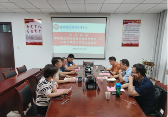 本网讯(汽车技术学院 刘晓宇)7月3日下午,徽商职业学院商贸系主任褚先文、副主任谷磊、汽车教研室主任贾屿一行3人到汽车技术学院调研交流。汽车技术学院副院长(主持工作)姜继文、汽车技术学院实训中心主任刘领及相关专业负责人、骨干教师参加座谈交流。会议由姜继文主持。