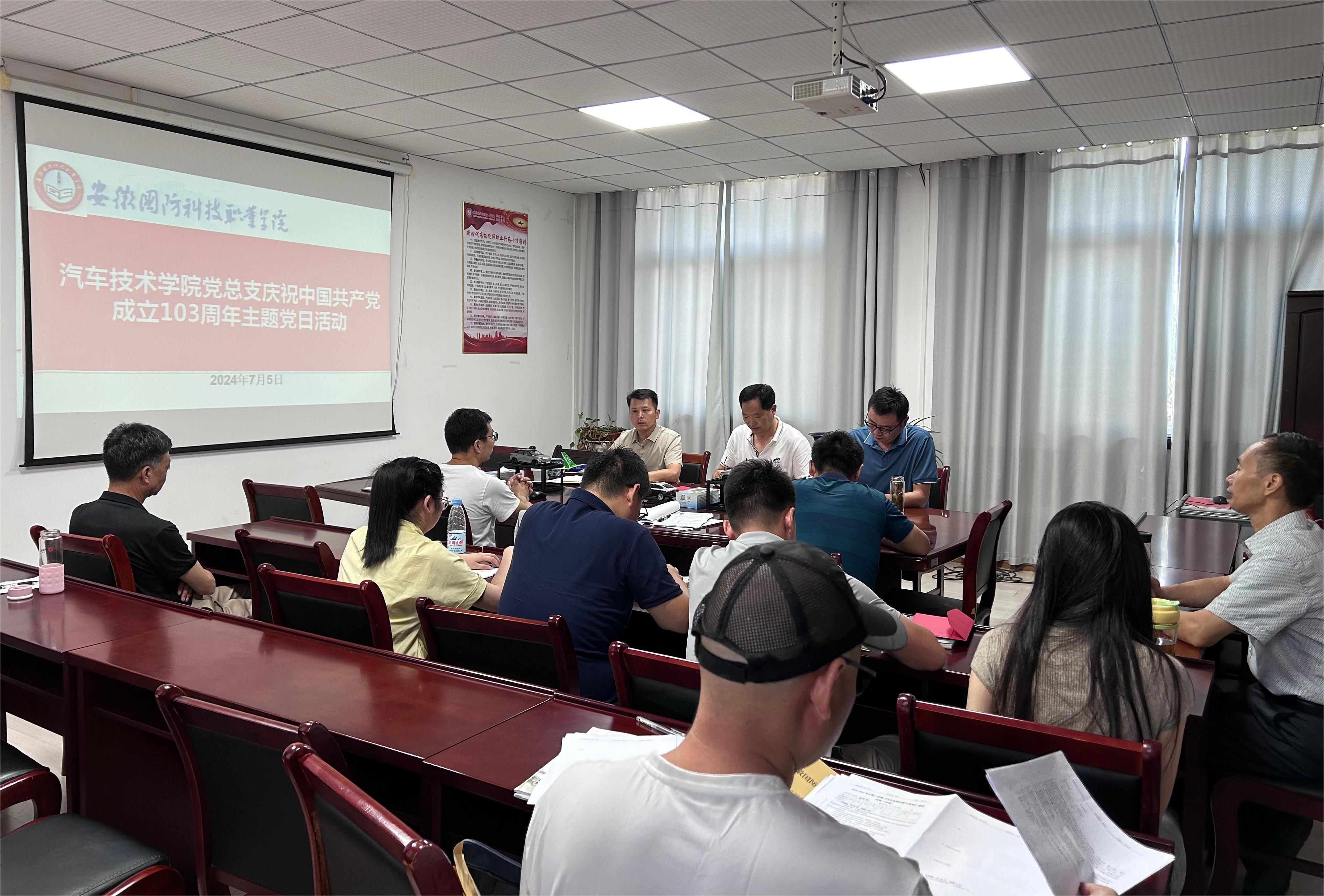 本网讯(汽车技术学院 任培培)为热烈庆祝中国共产党成立103周年,重温伟大建党精神,激励全体党员赓续红色血脉,永葆党员先进底色,踔厉奋发、砥砺前行,7月5日下午,汽车技术学院党总支组织开展庆祝建党103周年主题党日活动。院党总支副书记余桂刚主持活动,全体党员参加活动。