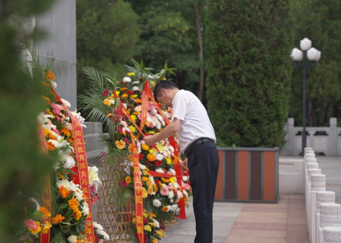 校党委书记余嗣元整理花篮缎带