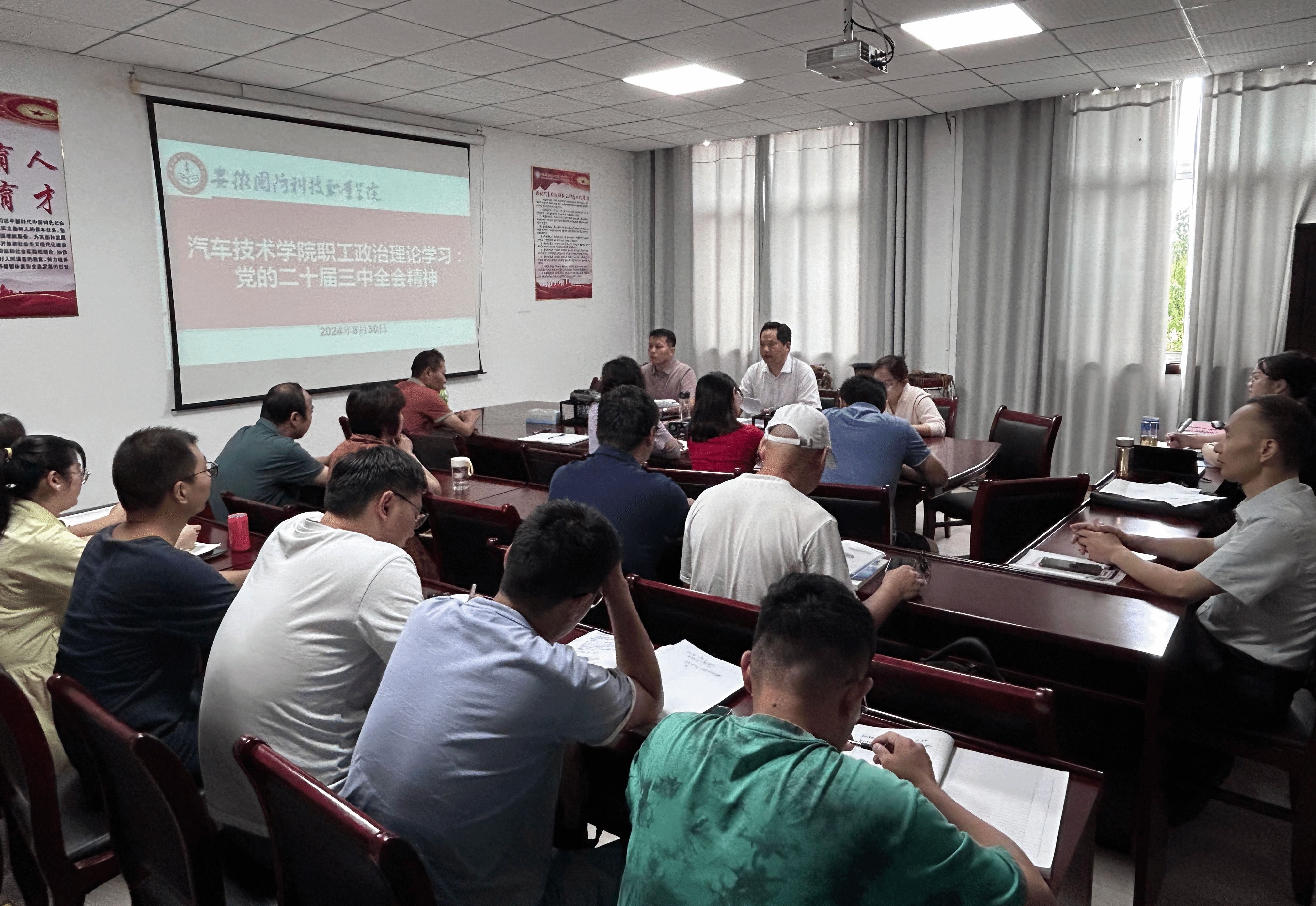 本网讯(汽车技术学院 任培培)为深入学习贯彻党的二十届三中全会精神,大力弘扬教育家精神,凝心聚力,推动2024年下半年重点工作稳步推进,8月30日上午,汽车技术学院召开全体职工会议,研究部署新学期重点工作,并组织全体职工学习党的二十届三中全会精神。院党总支书记孙良平主持会议。
