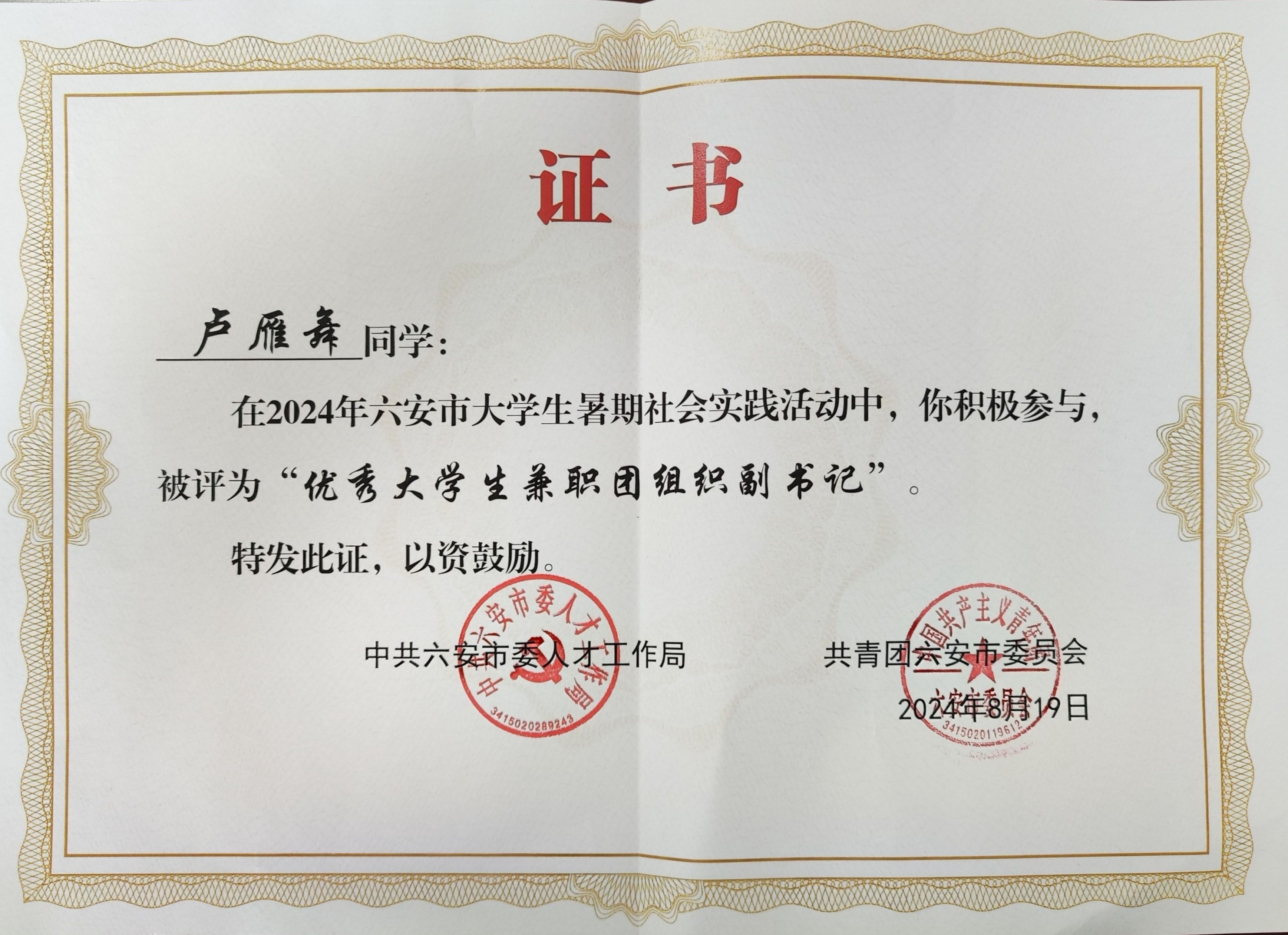 本网讯(信息技术学院 孙颖凯)为深入学习贯彻习近平新时代中国特色社会主义思想和党的二十大精神,进一步引导和帮助大学生在社会实践中受教育、长才干、作贡献。信息技术学院在学院党政领导的指导下,精心组织了2024年“三下乡”大学生暑期社会实践活动,其中涌现出一批表现优秀同学,2023级现代通信技术专业2班纪律委员卢雁舞结合理论与实践,在实践岗位彰显了国防学子的风采,最终荣获2024年大学生暑期社会实践六安市“优秀大学生兼职团组织副书记”称号。