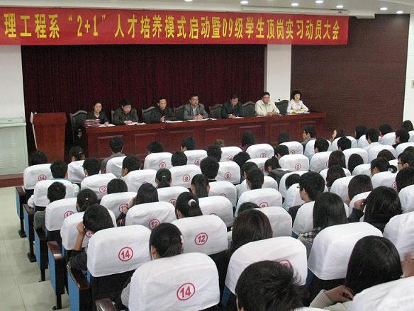 会上,张显国向09级全体学生作了动员报告。他要求,同学们要充分认识到实行“2+1”人才培养模式及毕业实习的重要性,要认真完成毕业实习内容,做好顶岗实习报告与毕业综合实践手册,以勤奋的工作态度顺利完成实习内容,为校争光。杜先扬要求同学们在实习期间要注意安全,端正工作态度,摆正就业心态,努力提高自身就业素质。刘圣春宣读了 “2+1”人才培养模式方案实施细则,并就如何撰写顶岗实习报告以及在撰写过程中需注意的一些事项与学生进行了交流。