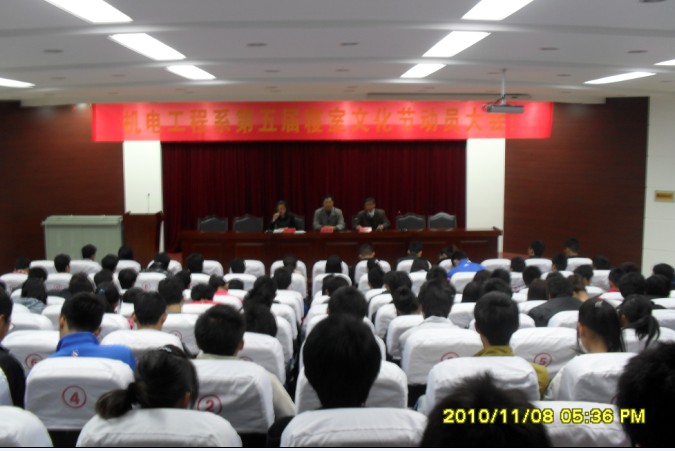 为丰富学生课余文化生活,营建温馨、舒适的宿舍环境,增强宿舍成员的团队协作能力,倡导积极向上的生活方式,2010年11月中旬,机电工程系团总支在图书馆二楼报告厅组织召开了第五届寝室文化节动员大会,系党总支书记孙良平、副书记叶启衡、系团总支书记刘严、学生会所有成员及所有寝室长出席本次大会。会议由刘严主持。