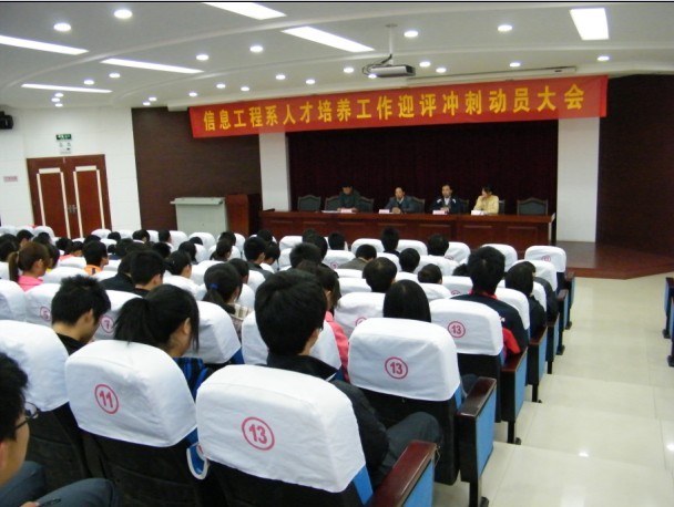 2010年11月12日下午四点,信息工程系在图书馆学术报告厅召开迎评促建冲刺动员大会,系党总支书记梁继会,团总支书记张伟业,系办公室主任兼主任辅导员王文堂,09级辅导员杨庆颖出席了本次大会并在主席台就座, 09、10级全体学生干部参加了大会。